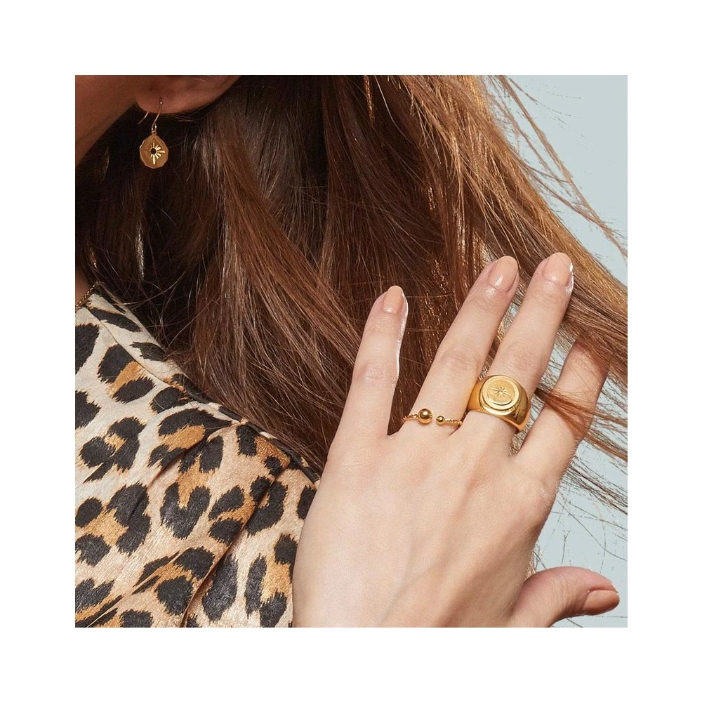 Cette bague chevalière signée Zag Bijoux est en acier doré à l’or fin. Elle est composée de cercles et d’une étoile en son centre.