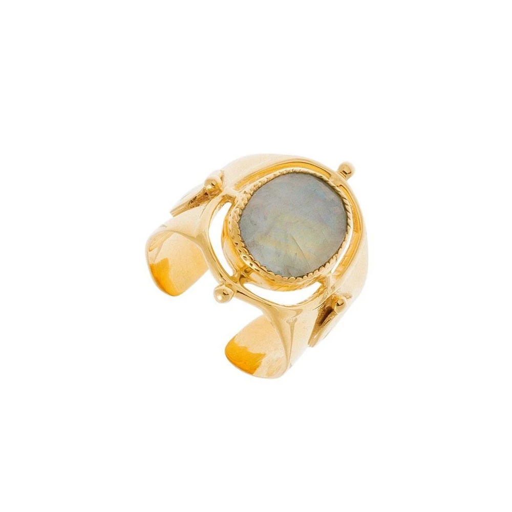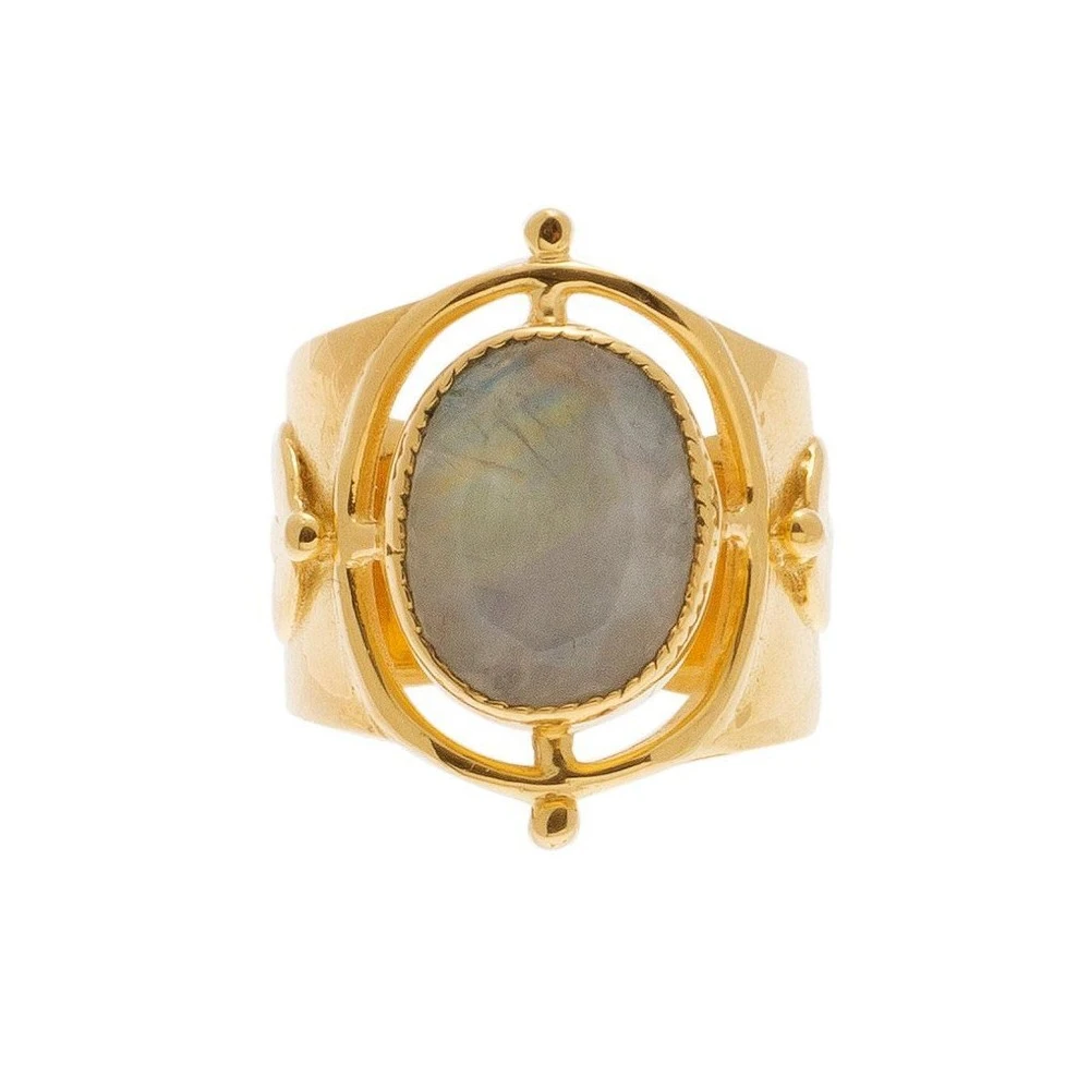 Bague chevalière en laiton plaqué or 3 microns, signée Leticia Ponti, composée d’une pierre de lune facettée sertie.
