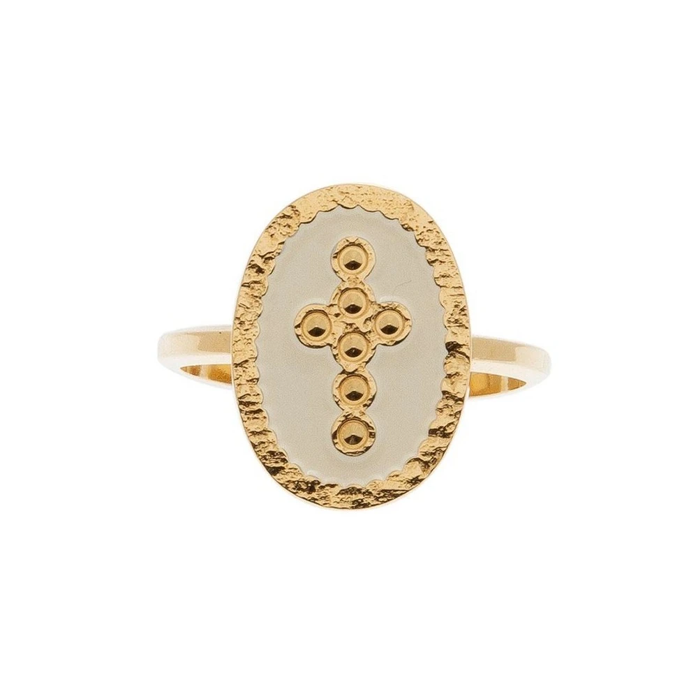 Bague signée Lovely Day, elle est composée d’un oval doré texture qui comporte un motif croix émaillée noire et dorée.