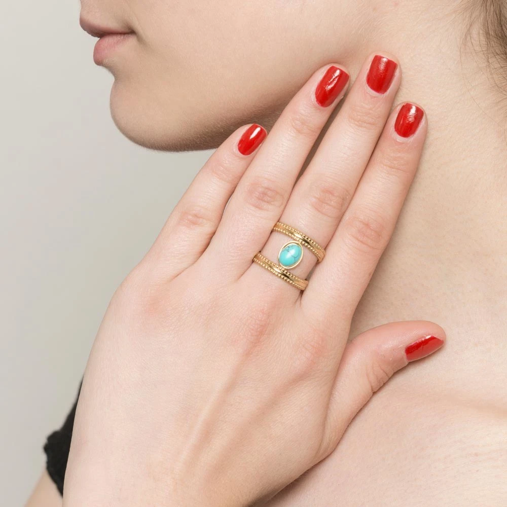 Bague double couronnes et pierre en turquoise en acier chirurgical trempé dans un bain doré signée Siloé.
