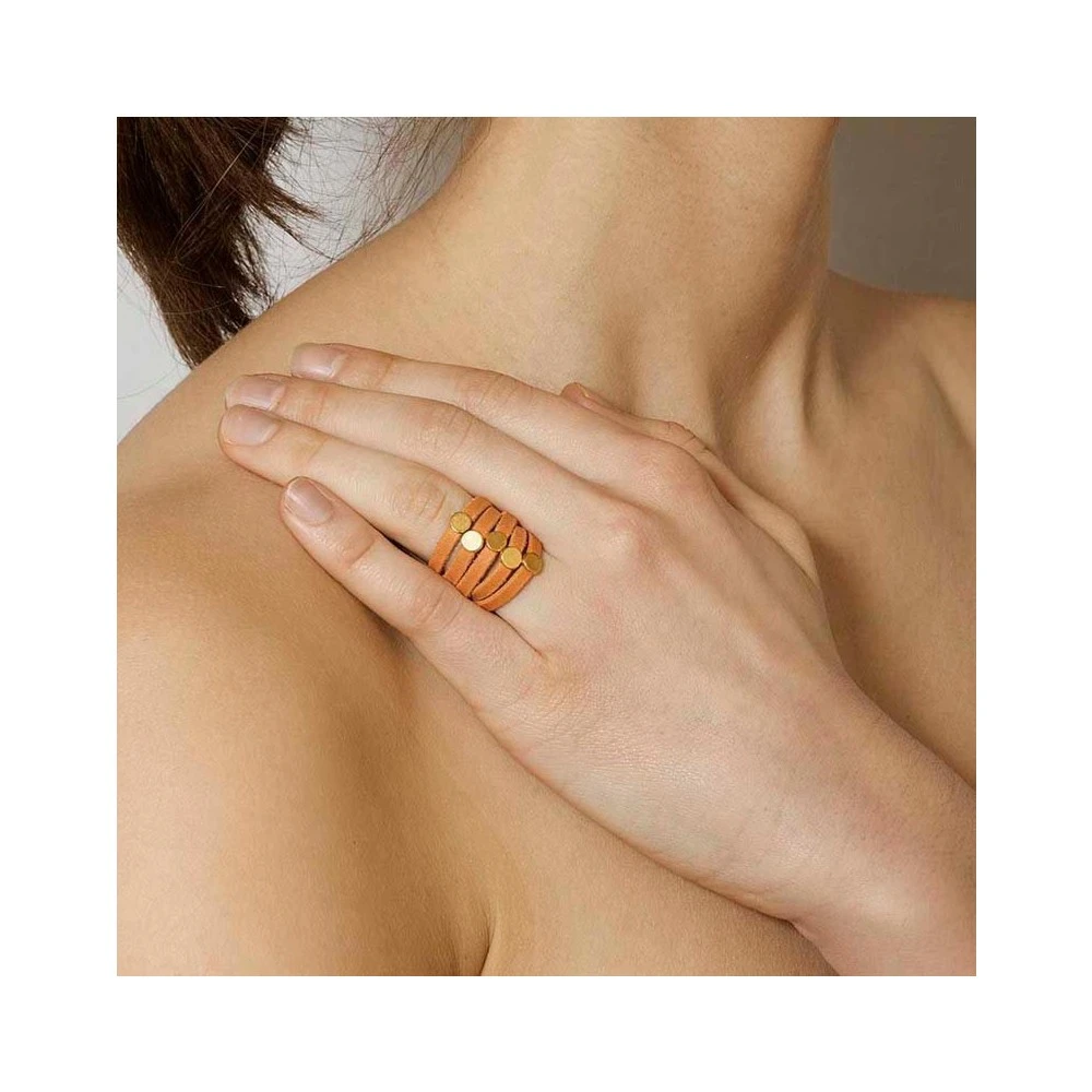 Bague signée Poapo. Ce bijou est en cuir corail de haute qualité, les lanières en cuir sont ornées de délicates perles plates dorées.