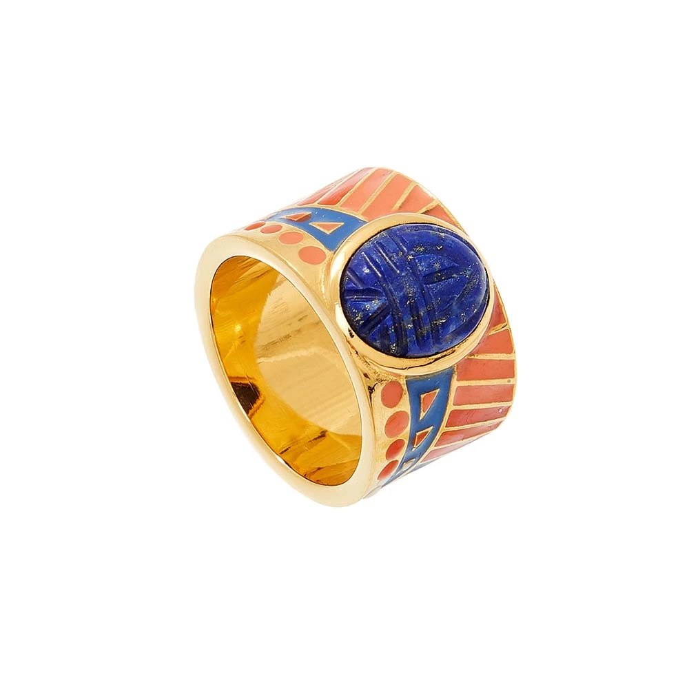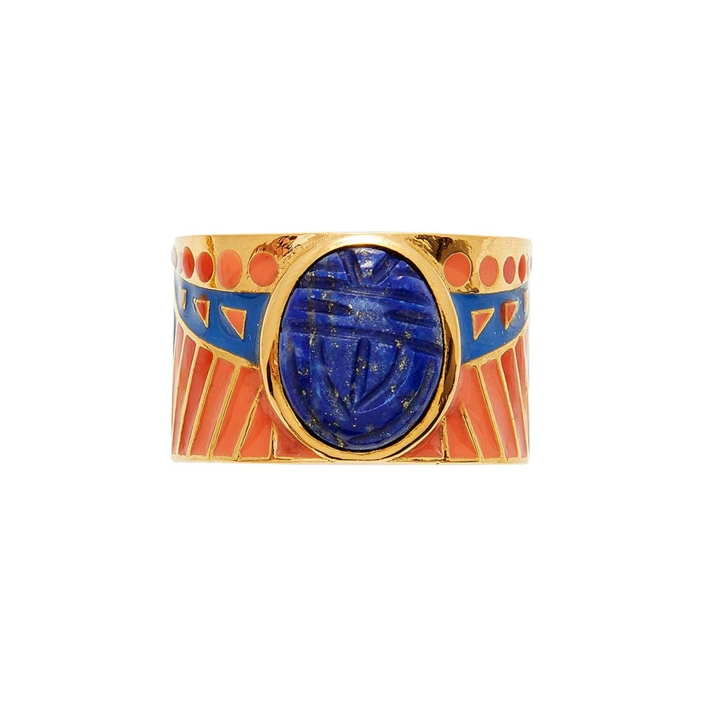 Bague en pierre de lapis, aux motifs ethniques. Il est signé Une A Une en laiton doré à l’or fin 18 carats et 1 micron.