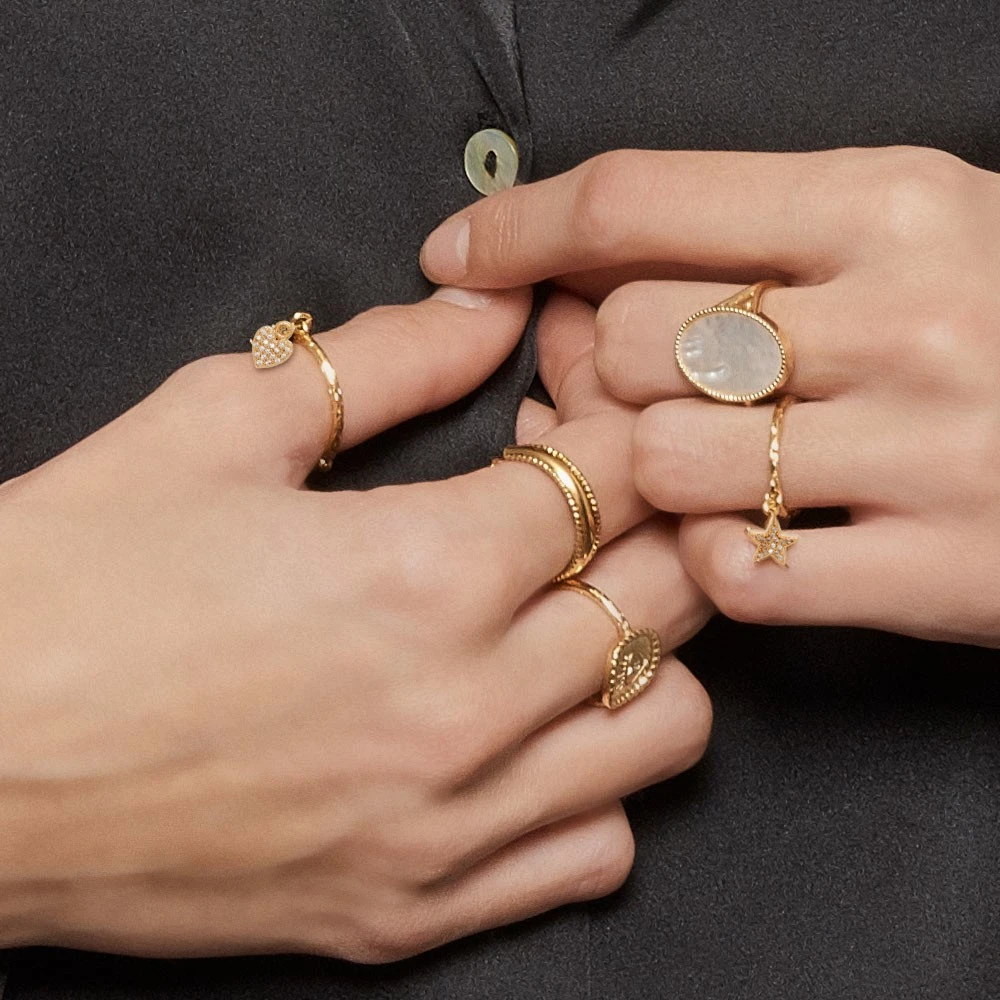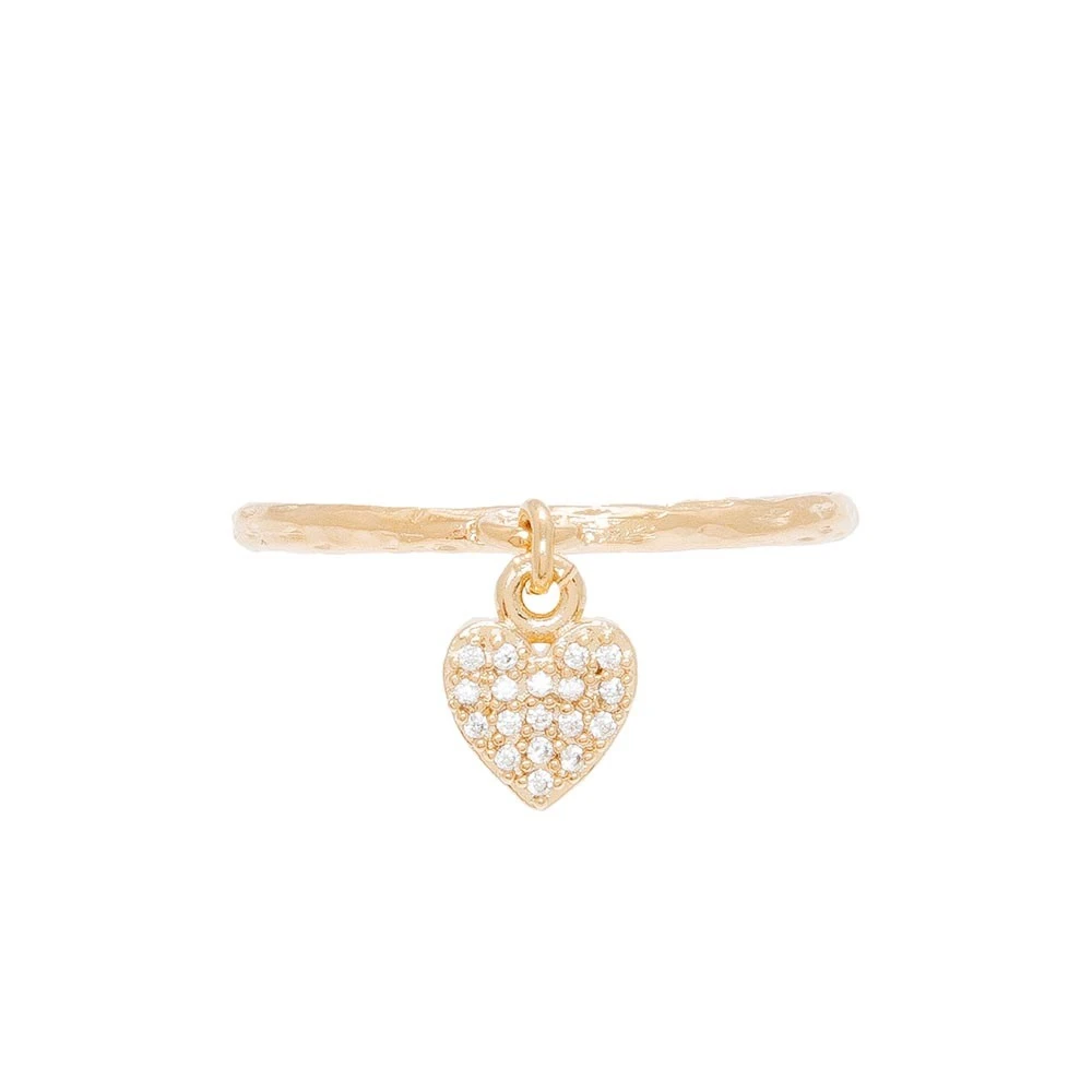 Cette bague fine martelée est signée Nilaï Paris et est dorée à l’or fin 24k. Elle est ornée d’un petit pendentif coeur avec des zircons.