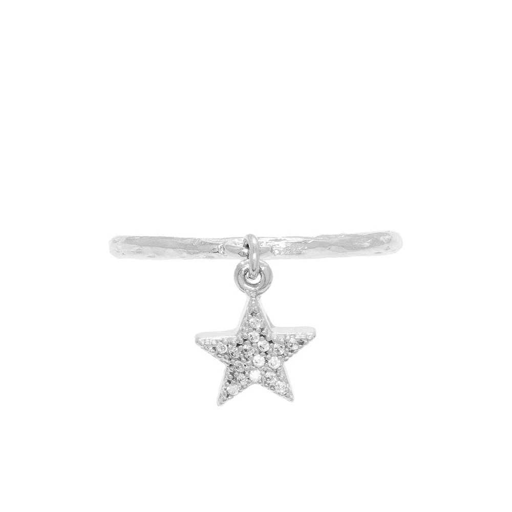 Cette bague fine martelée est signée Nilaï Paris en laiton argenté. Elle est ornée d’un petit pendentif étoile avec des zircons.