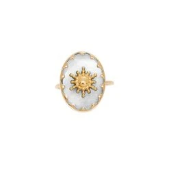 Cette bague fine martelée est signée Nilaï Paris en laiton argenté. Elle est ornée d’un petit pendentif oeil avec des zircons.