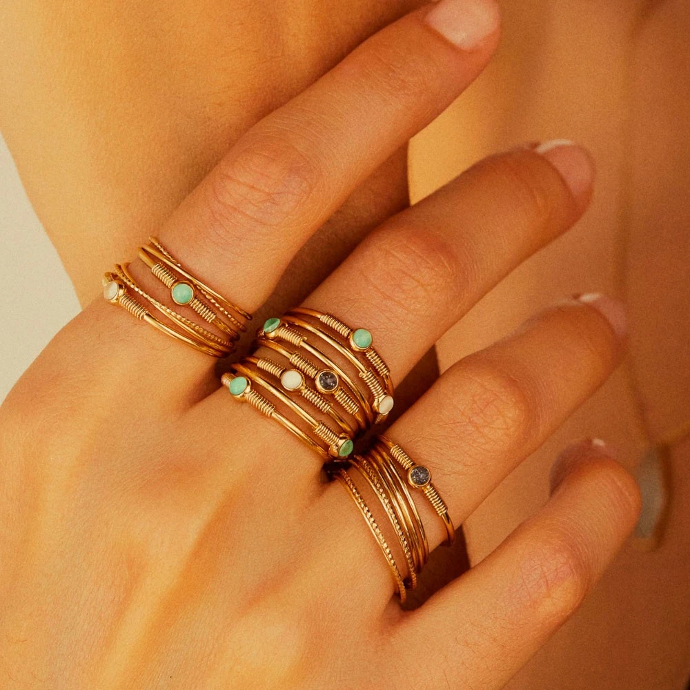 La bague est ornée d’une petite pierre en émail noir pailleté. Elle est légèrement torsadée sur le dessus.