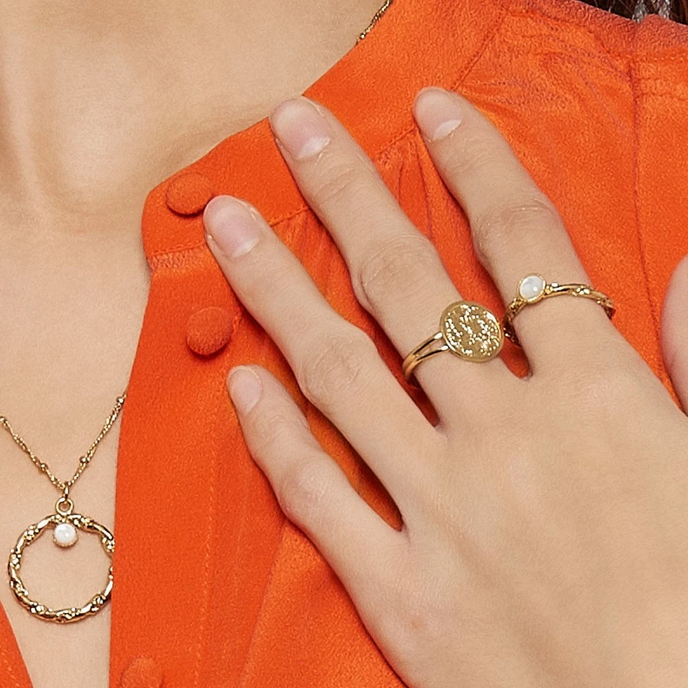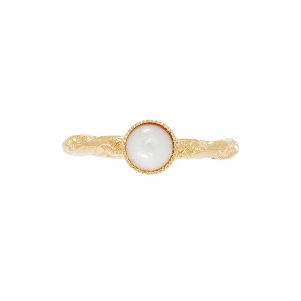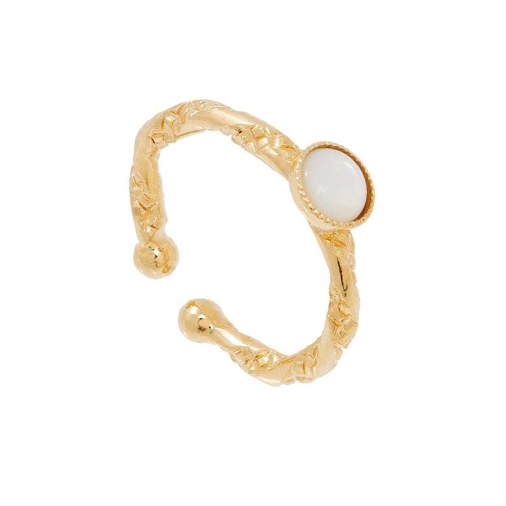 Bague fine ouverte signée Aurélie Joliff, dorée à l’or fin 24 carats. La bague est composée de deux billes aux extrémités. L’anneau est torsadé tout le long. Une pierre ronde en nacre orne le dessus de la bague.