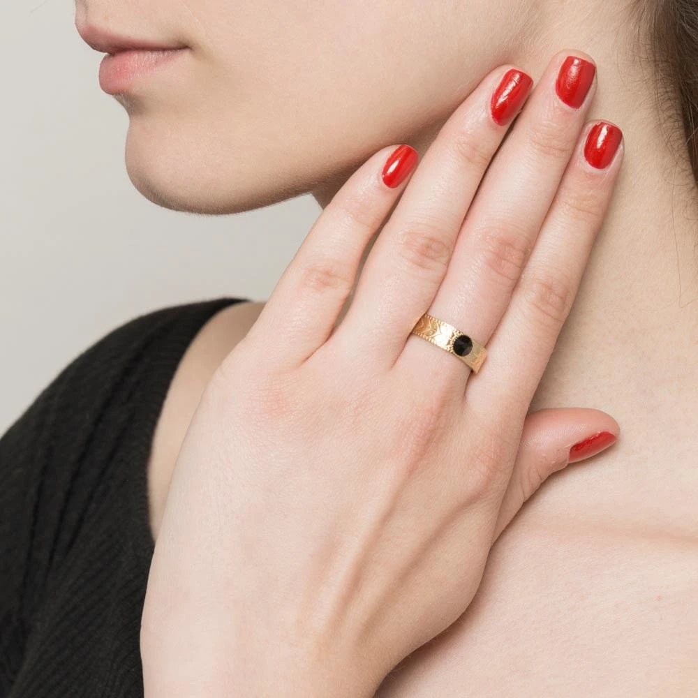 Bague gravée en acier chirurgical trempé dans un bain doré sélectionnée par Jollia.