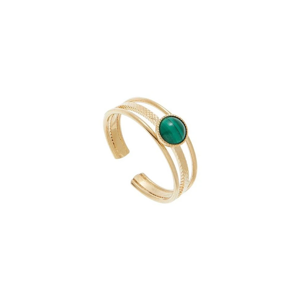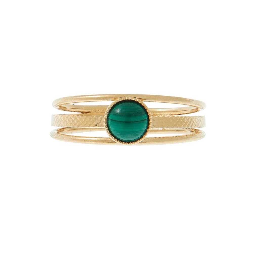 Cette bague très féminine est une création d’Aurélie Joliff. Les trois rangées de la bague sont dorées et ornées d’une pierre malachite.