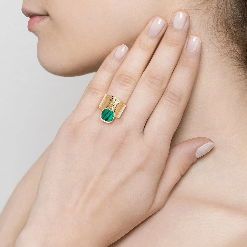 Bague signée Siloé, en acier inoxydable. La bague est large et composé d’un pendentif carré en pierre malachite.
