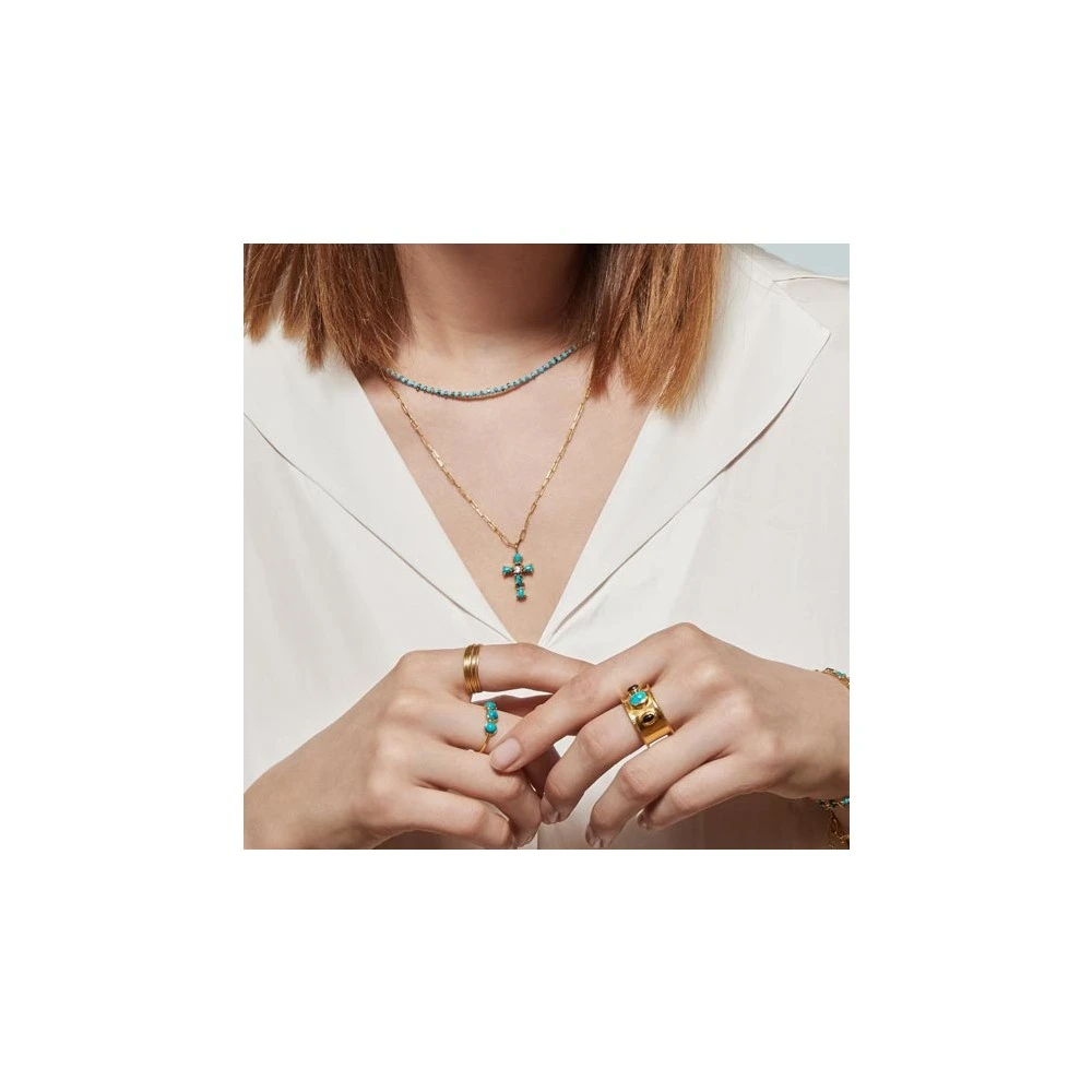 Cette bague large composée de 3 pierres semi précieuses, deux en onyx et une en turquoise, est dorée à l’or fin 1 micron et est signée Une A Une.
