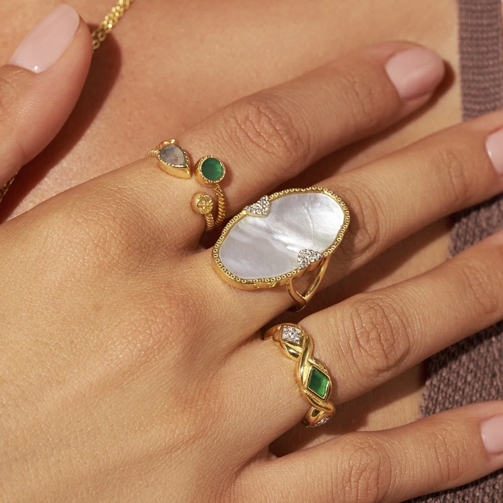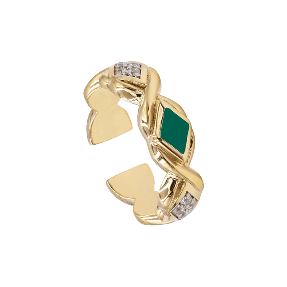 Bague signée Be Maad, de la collection Sani, fabriquée à la main en laiton doré à l’or fin 18K, sertie de zircons blancs et d’onyx vert.