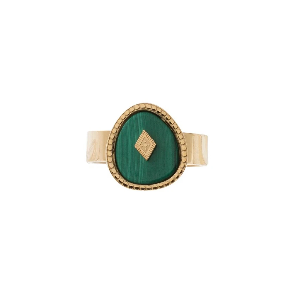 Bague sertie d’une pierre en malachite signée Zag Bijoux. Elle est en acier chirurgical trempé dans un bain doré.