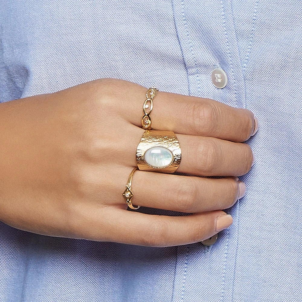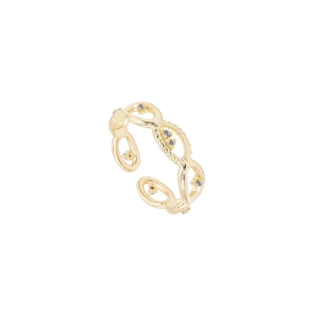 Cette bague maillons signée Be Maad est fabriquée à la main en laiton doré à l’or fin 18K et sertie de zircons blancs.