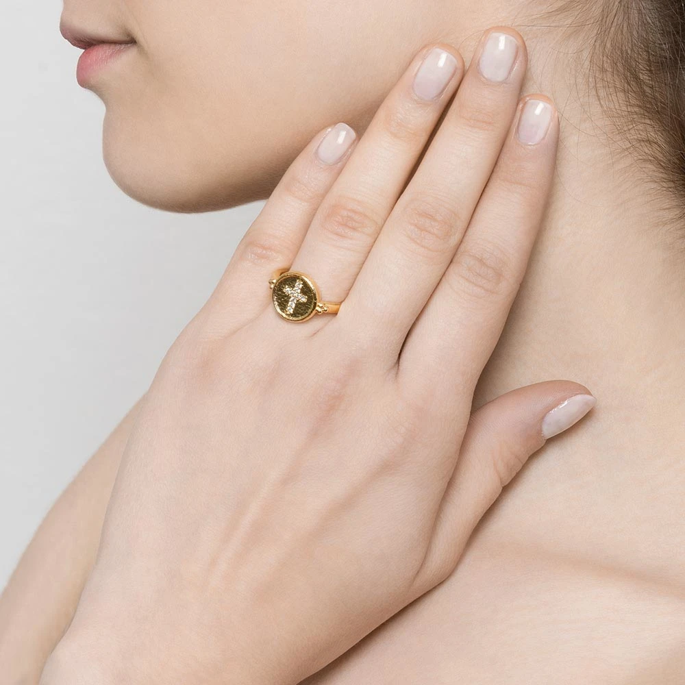 Cette bague dorée signée Virginie Berman est composée d’une médaille avec à son centre une croix agrémentée de zircons blancs.