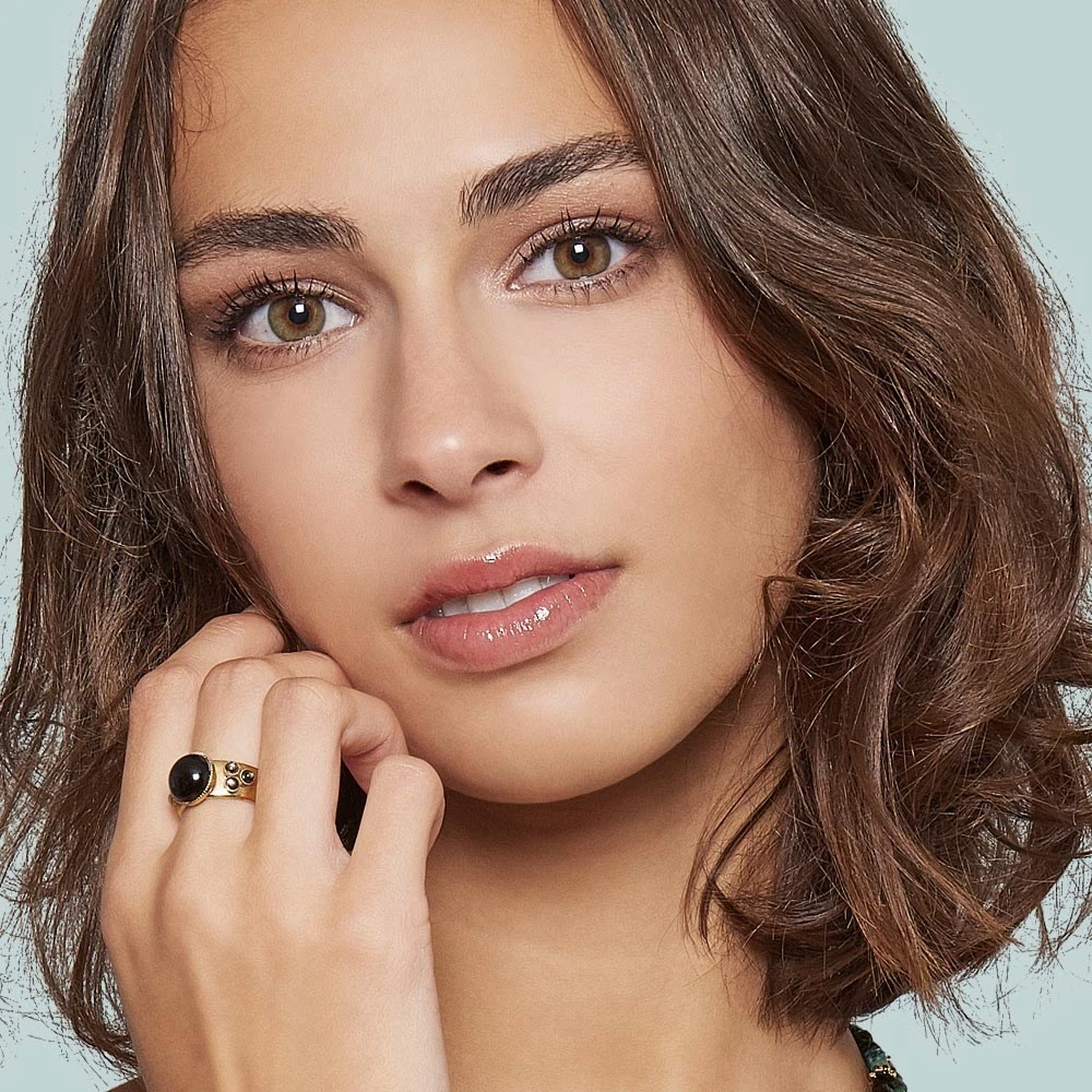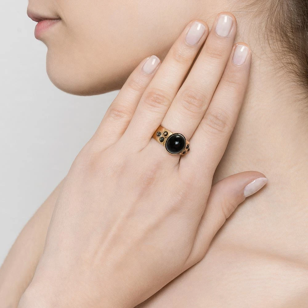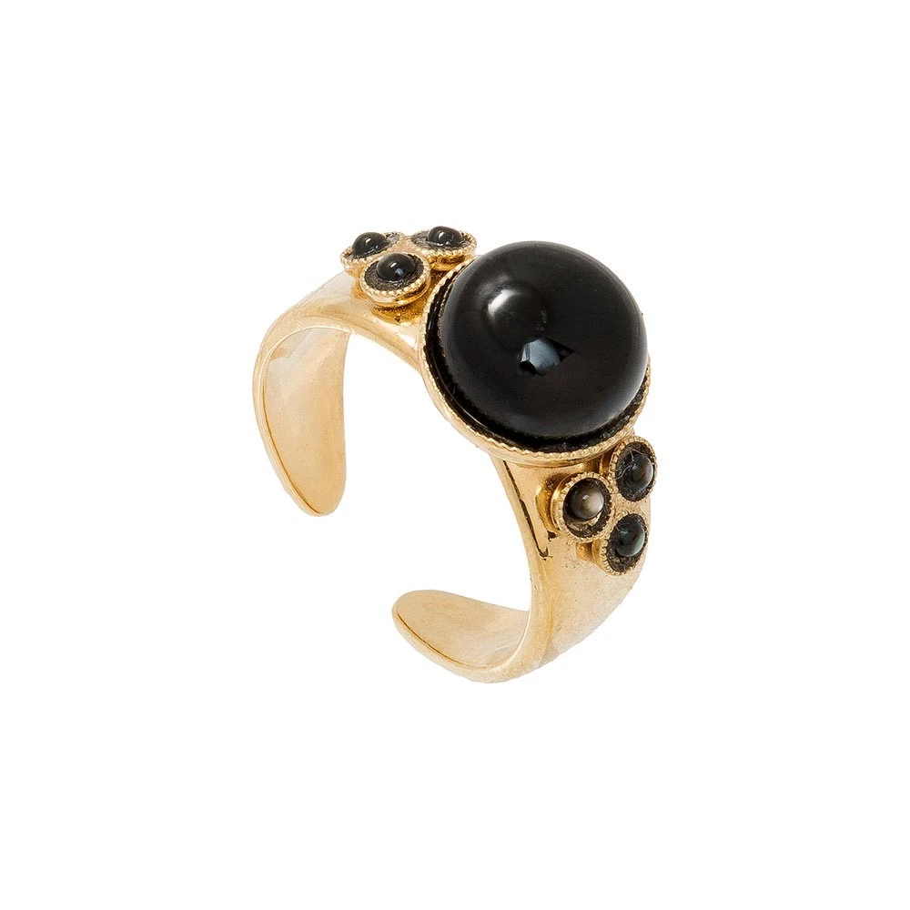 Bague multi-pierres en plaqué or signée Agnès Paris, composée de pierres en onyx noir et en nacre grise.