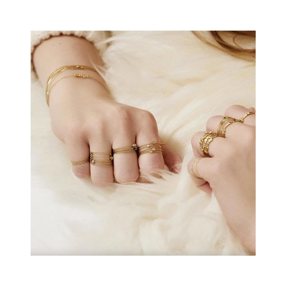 Cette bague en plaqué or 3 microns de la collection Trésors et signée BDM Studio, est composée de 5 anneaux agrémentés d’un cristal et d’une pierre semi-précieuse en opaline.