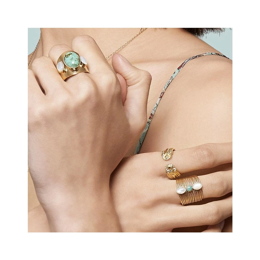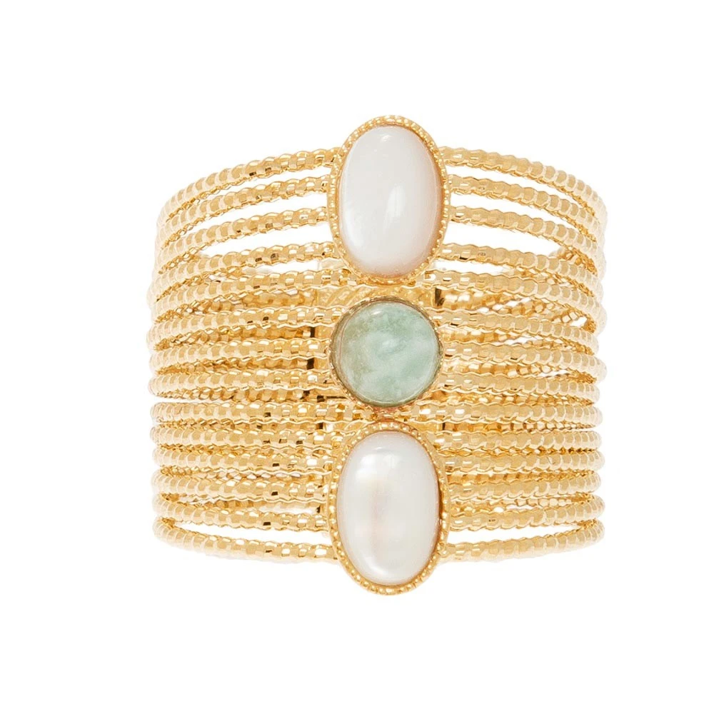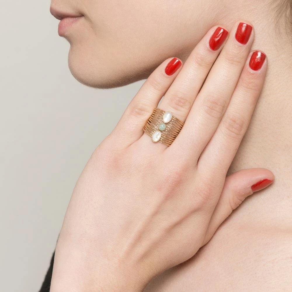 Bague multirangs triple pierres en nacre et en amazonite signée Fabien Ajzenberg.