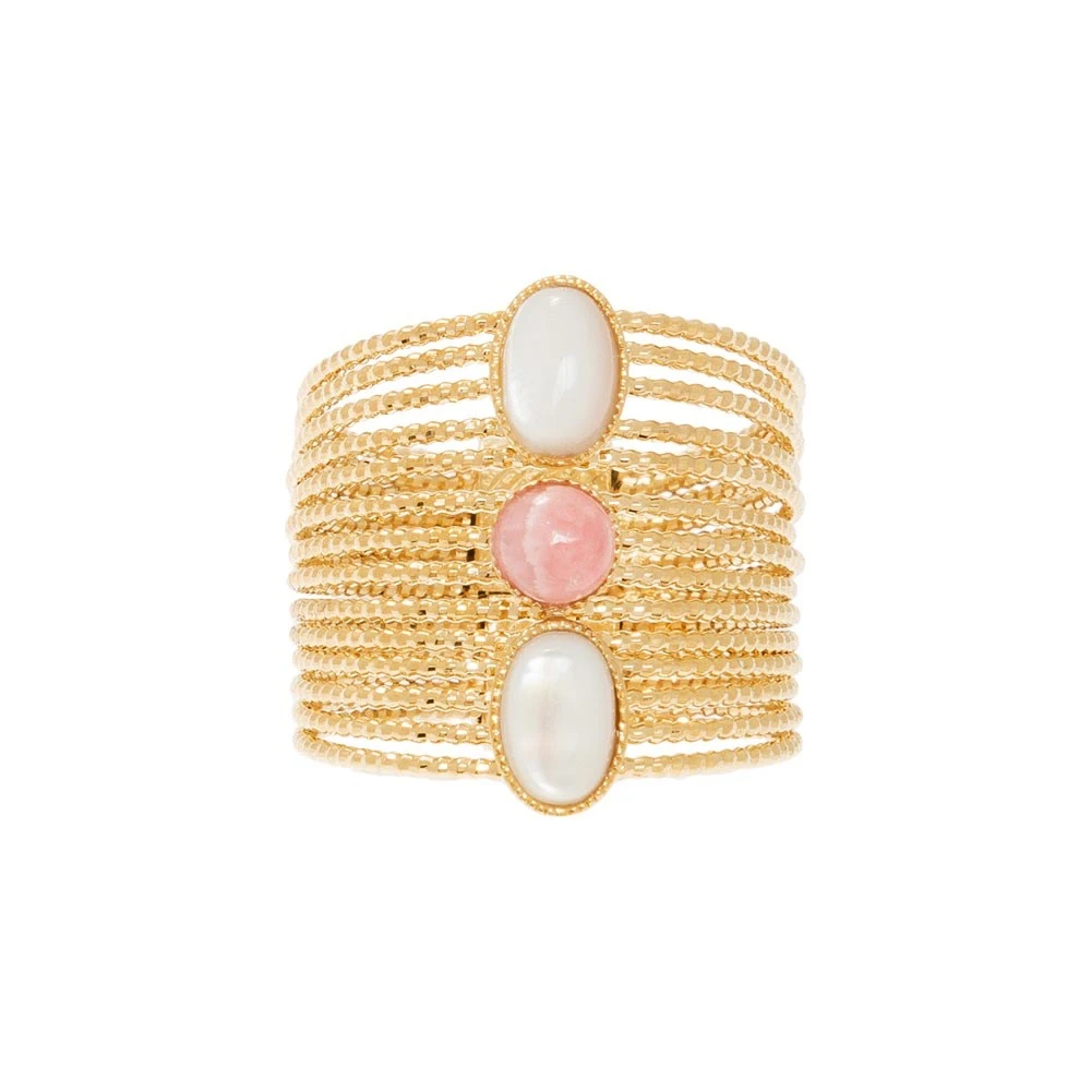 Bague multirangs triple pierres en nacre et en quartz rose signée Fabien Ajzenberg.