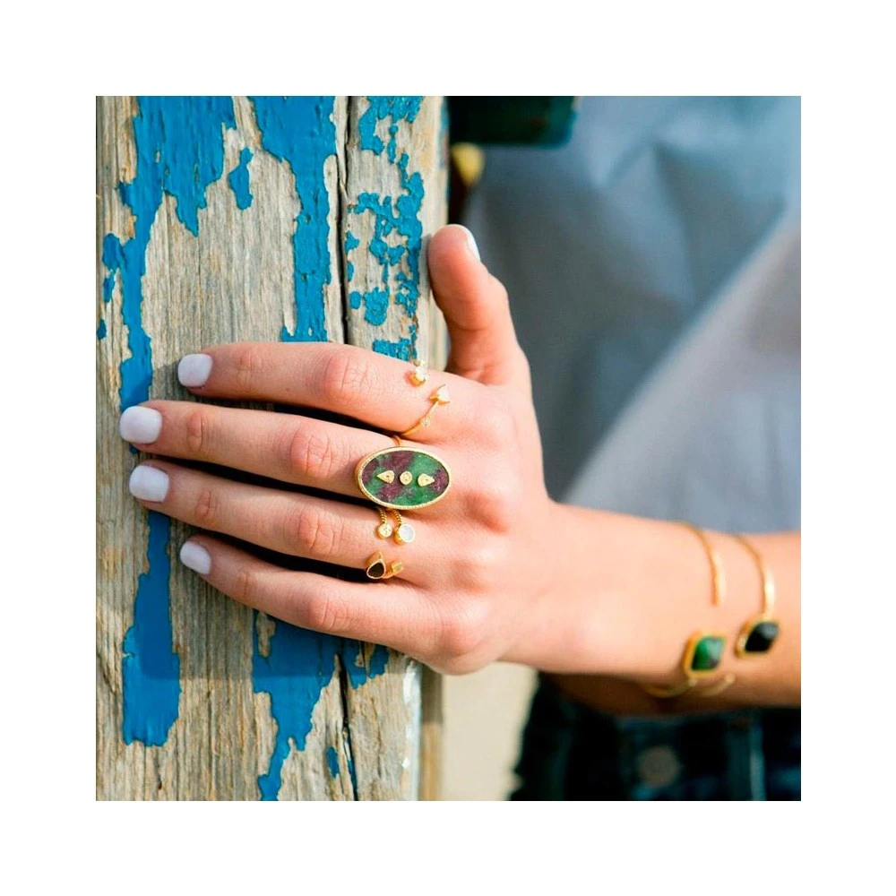 Cette bague est fabriquée à la main en laiton doré à l’or fin 18K et sertie d’un onyx texturé