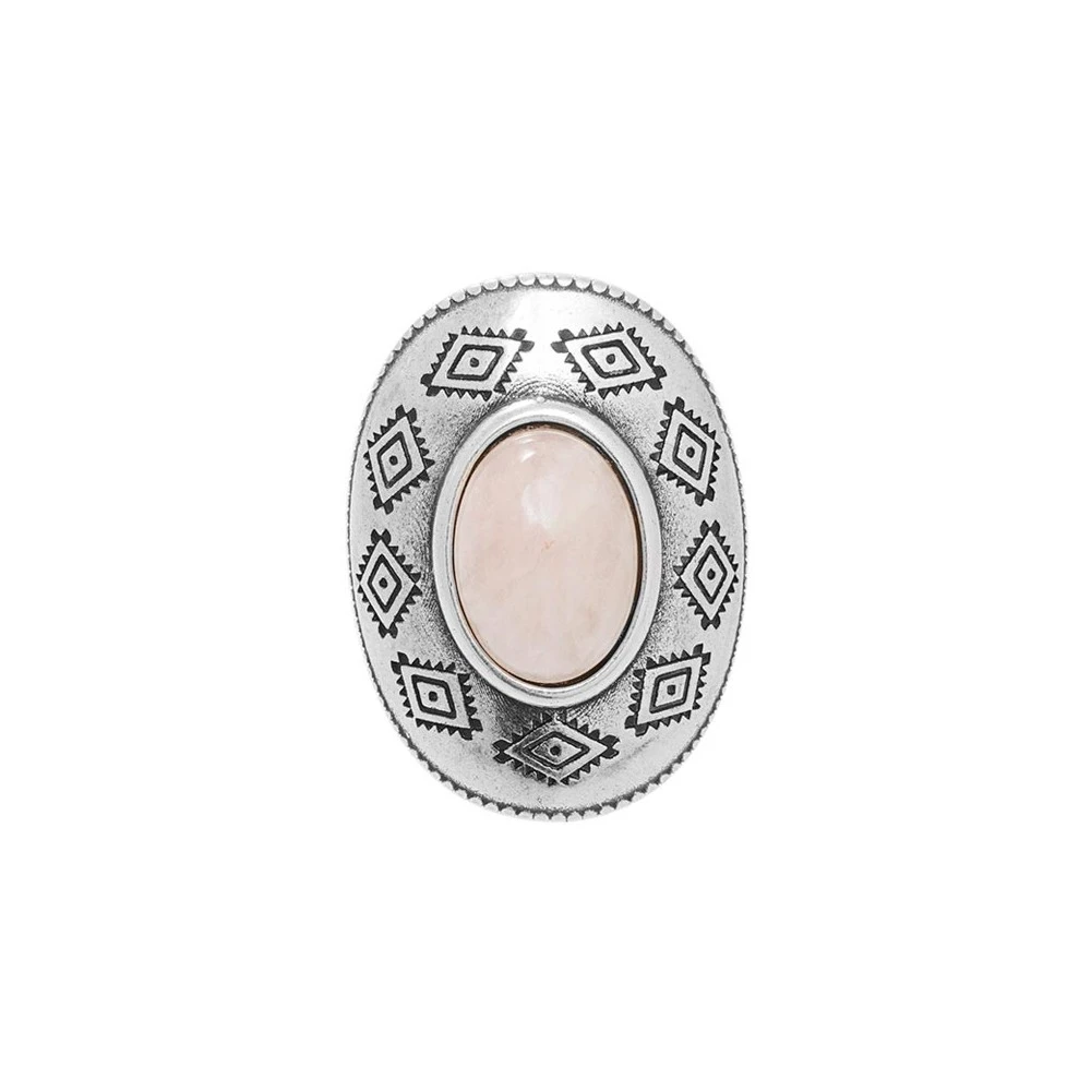 Bague XXL ovale argenté avec une pierre rose en son centre. Elle est signée Shabada et est d’inspiration ethnique. Elle est en laiton trempé dans un bain argenté.