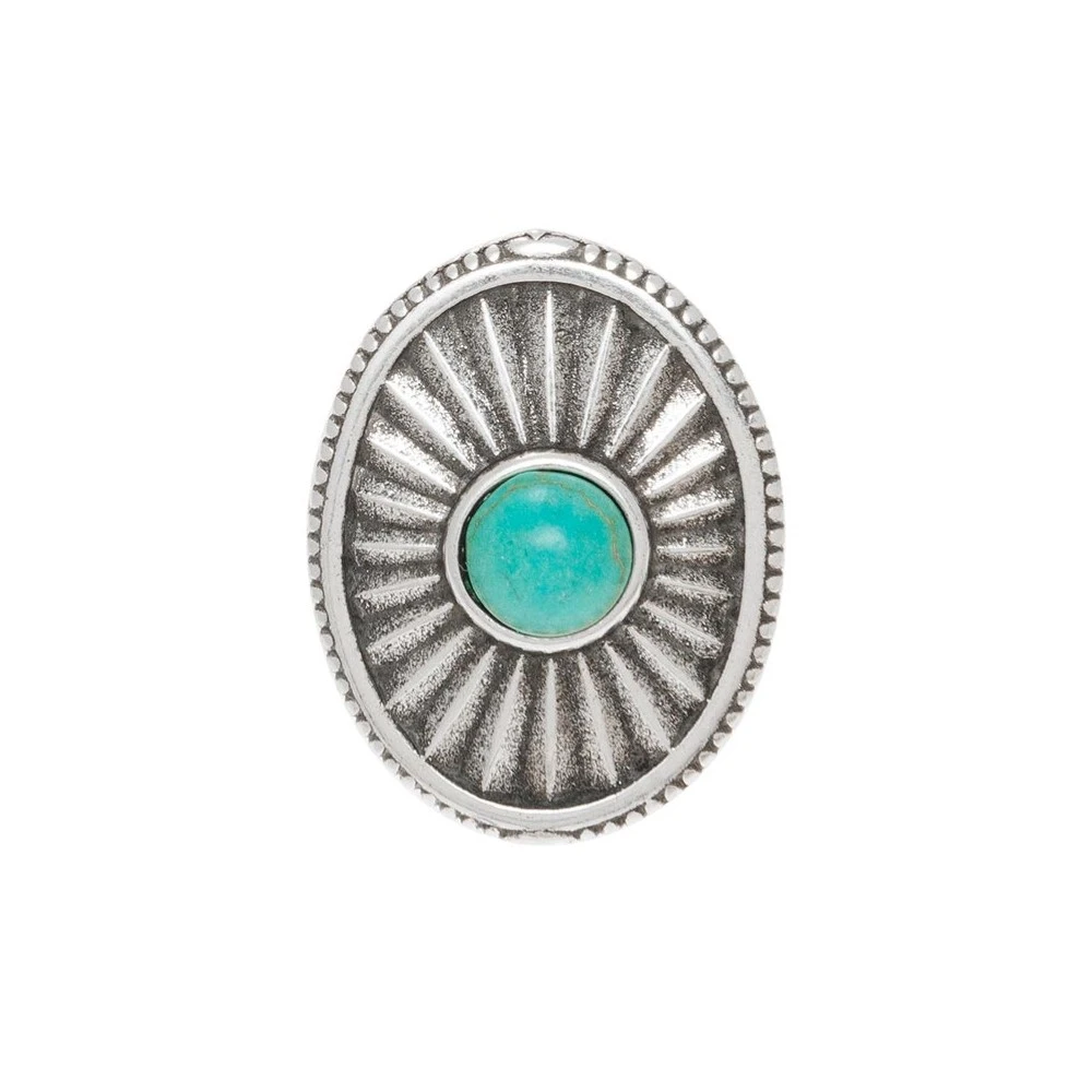 Cette bague argenté en forme ovale, signée Shabada est décorée de motifs soleil et composée d’une pierre naturelle semi-précieuse en turquoise.