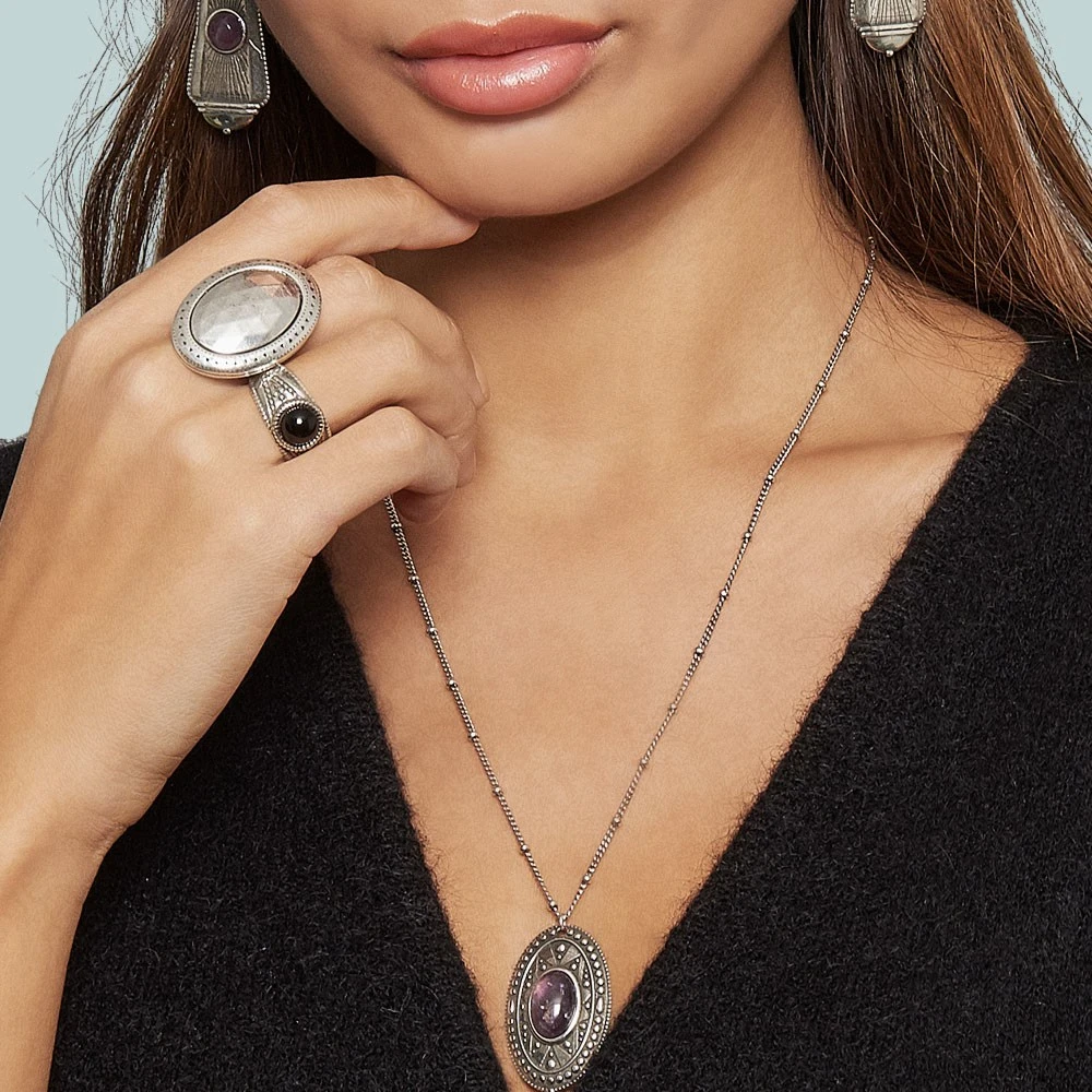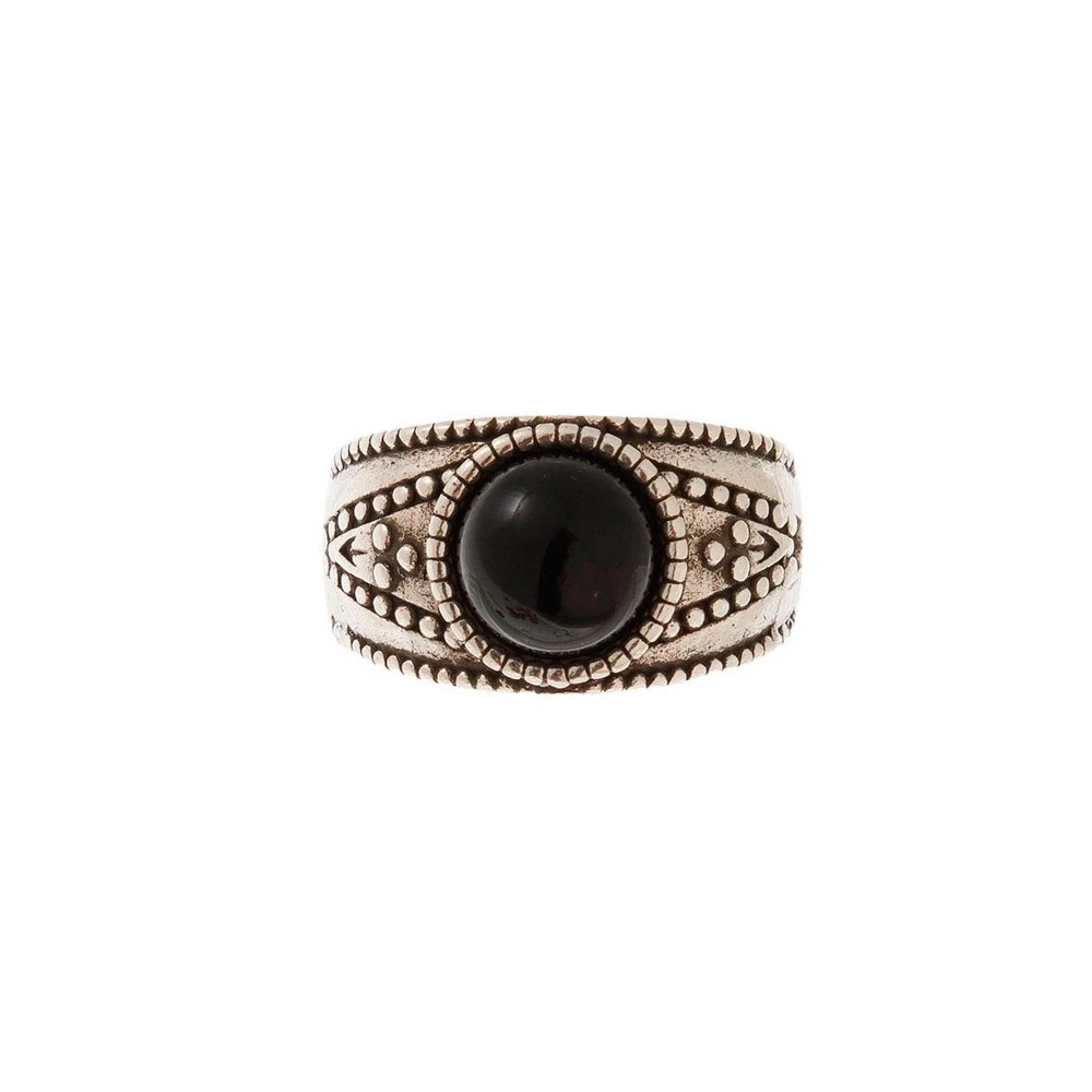Cette bague signée Shabada est en laiton argent. Celle-ci est ornée d’une pierre hématite noire et composée d’ornements en forme de petits points.