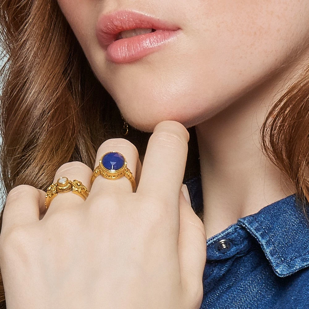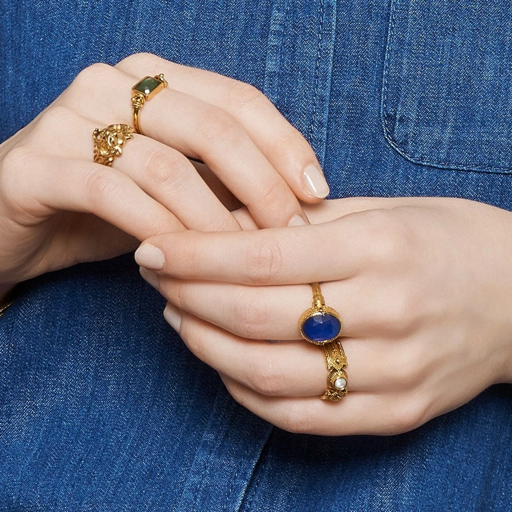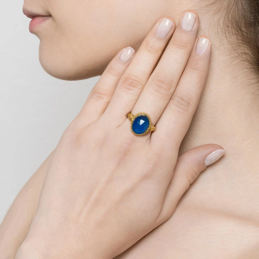 Cette bague ovale est ornée d’une pierre en agate bleue.