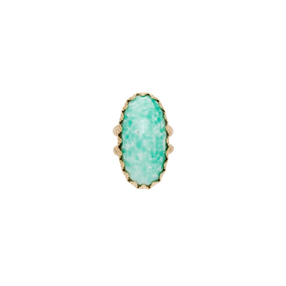 Bague en plaqué or signée Les Folies d’Agnès, composée d’une large pierre en amazonite.