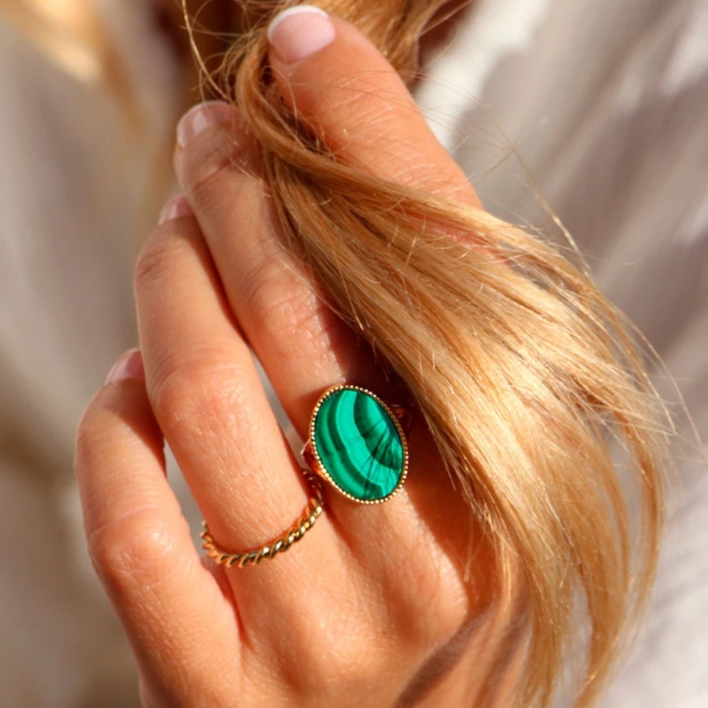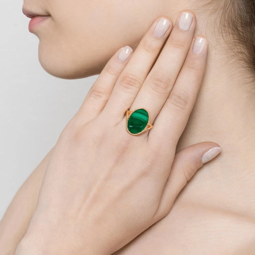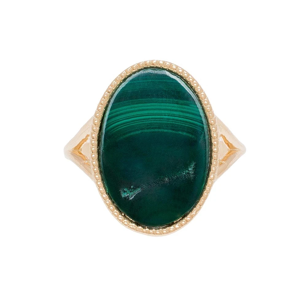 Cette bague est signée Nilaï Paris et est dorée à l’or fin 24k. Elle est surmontée d’une somptueuse pierre ovale plate en malachite.