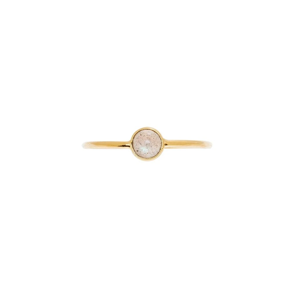 Cette bague dorée est composée d’une pierre semi-précieuse labradorite.