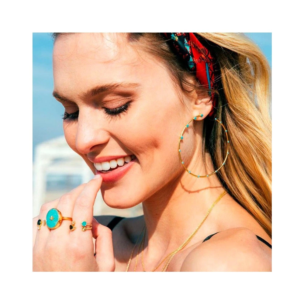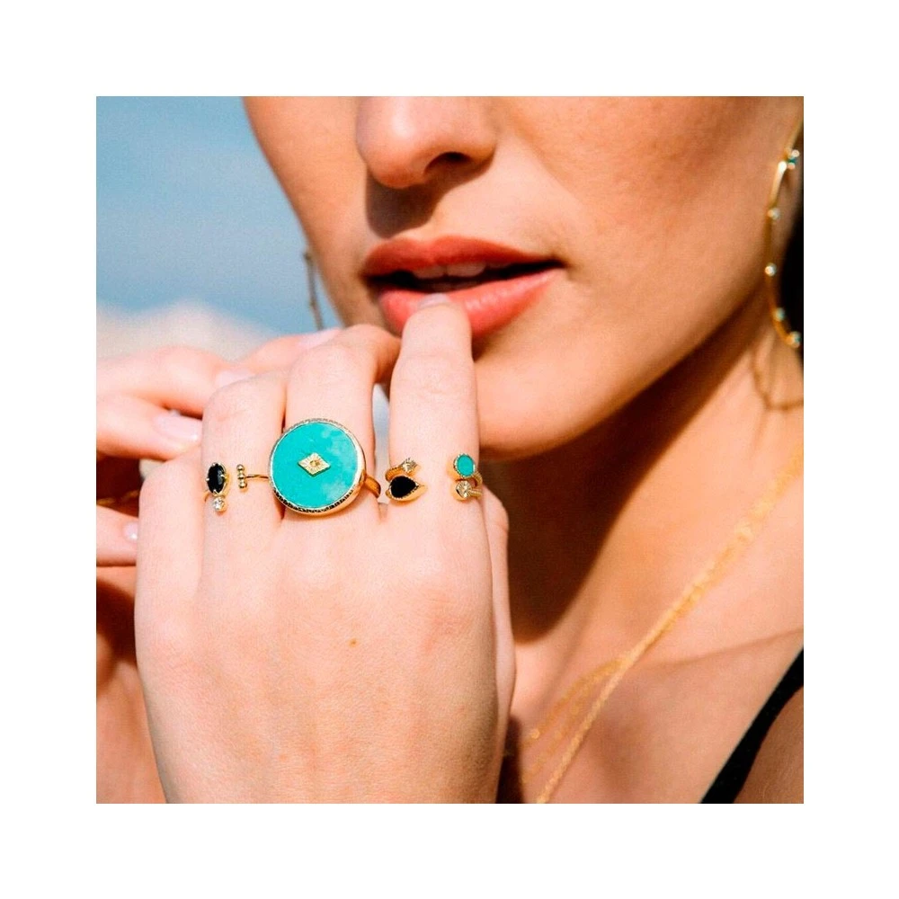 Cette bague signée Be Maad est fabriquée à la main en laiton doré à l’or fin 18K et sertie d’une turquoise.