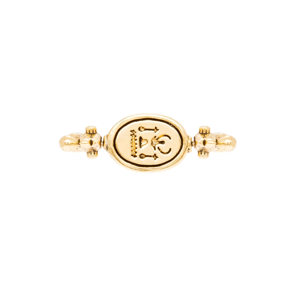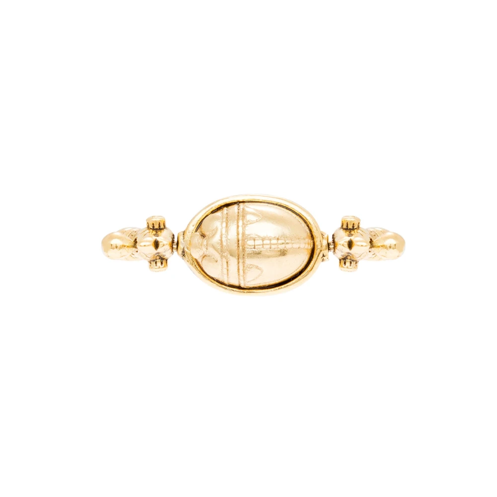 Cette bague vintage pivot présente un scarabée dorée. Les deux faces du pendentif central sont gravées.