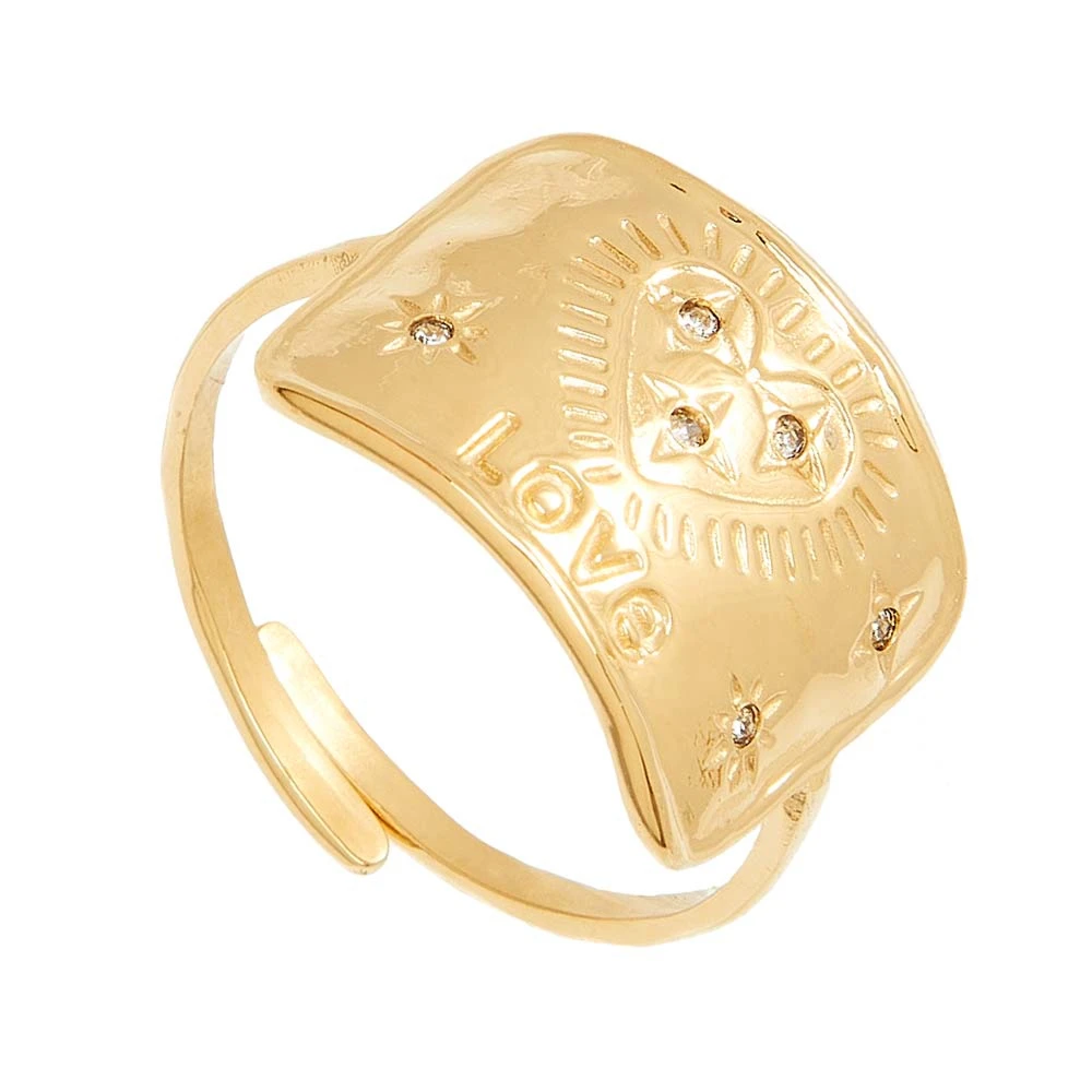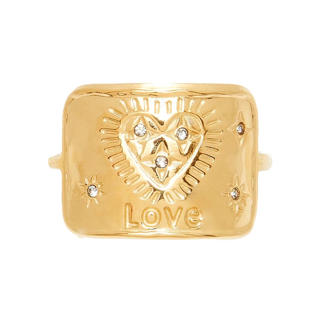 Bague en acier inoxydable dorée ornée d’un talisman rectangle. Sur celui-ci, sont gravés un coeur et des étoiles, tous ornés d’un zircon.