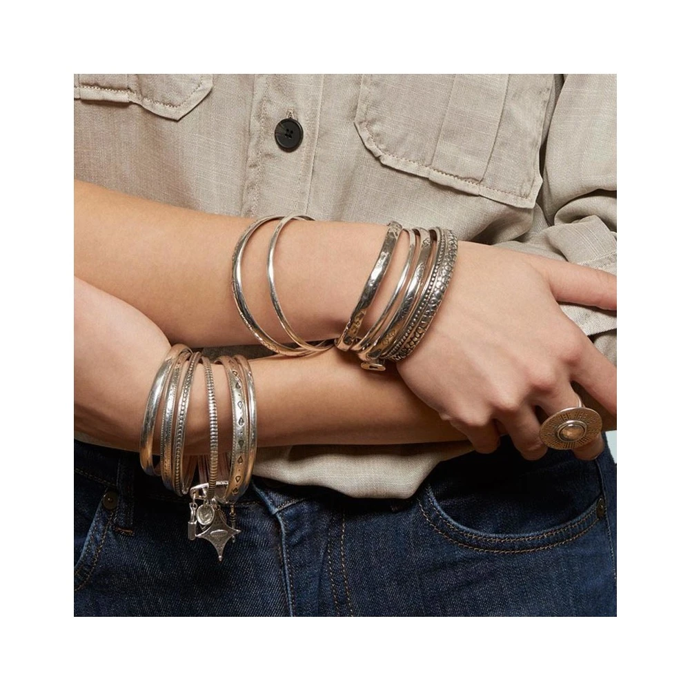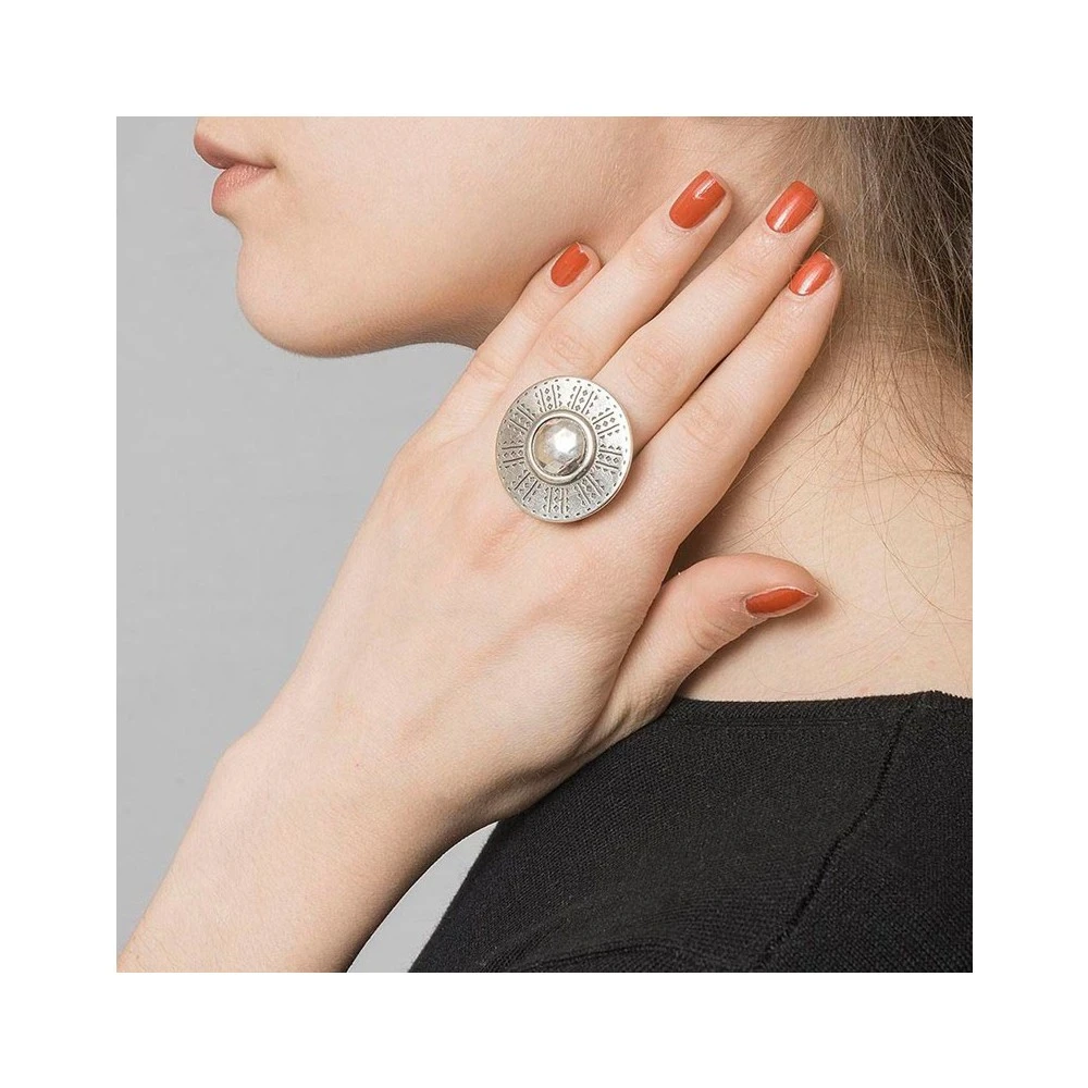 Cette bague argentée de forme ronde, signée Shabada, fait partie de la collection Ibiza. Elle est décorée de motifs aztèques.
