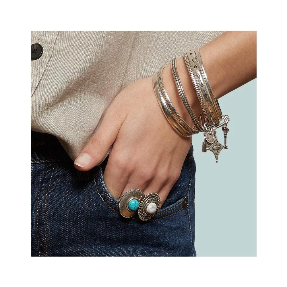 Cette bague argentée de forme ronde, signée Shabada, fait partie de la collection Sibi Bou Said. Elle est rond à motifs aztèques sertie d’une pierre blanche en son centre.