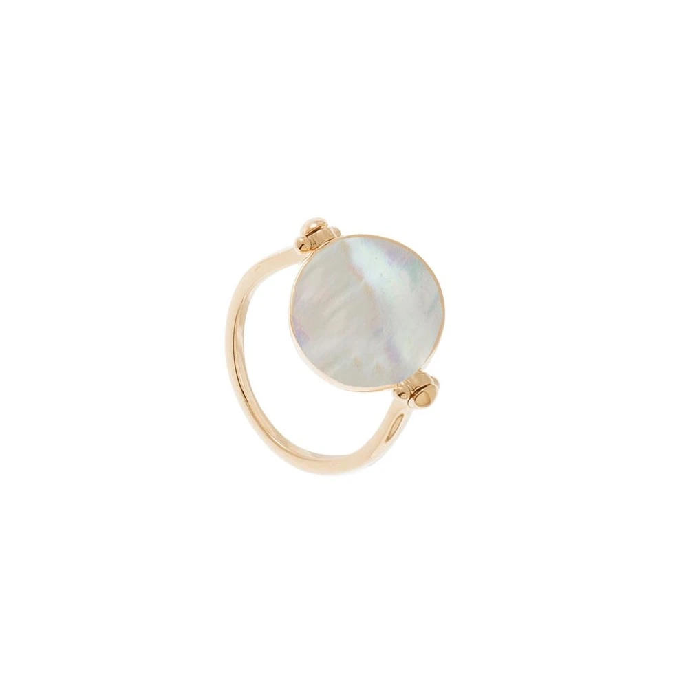 Bague réversible signée By Jollia. Celle-ci est en plaqué or et composée de deux faces, l’une dorée, l’autre nacrée.