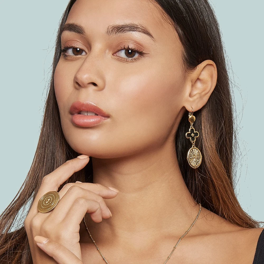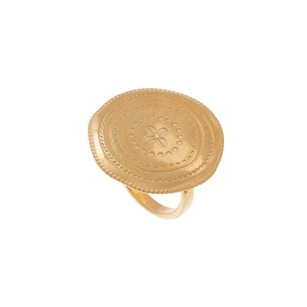 Bague ronde XXL motifs, d’inspiration ethnique, signée Shabada en laiton trempé dans un bain doré.