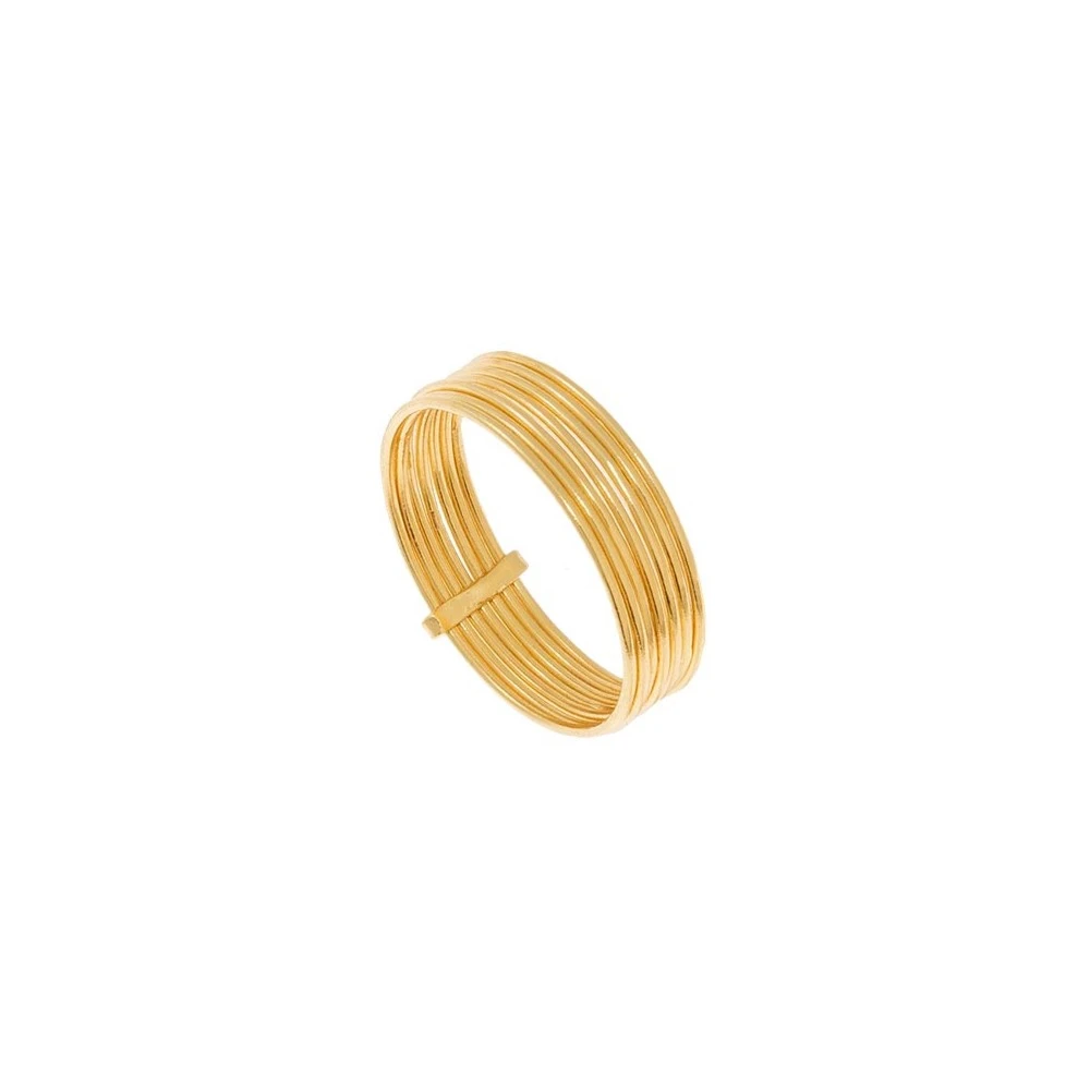 Cette bague semainier est dorée à l’or fin et composées de plusieurs anneaux lisses reliés par une barre.