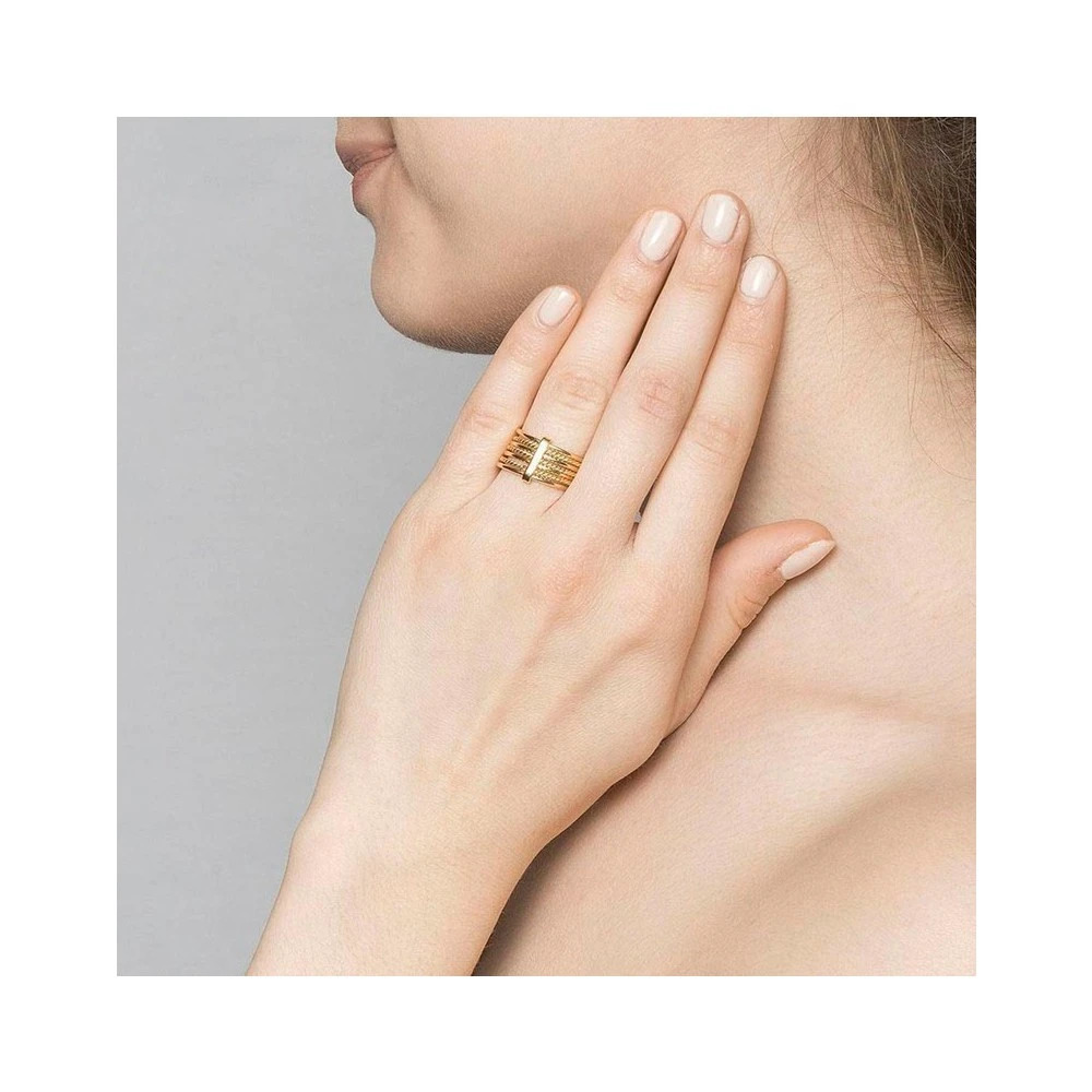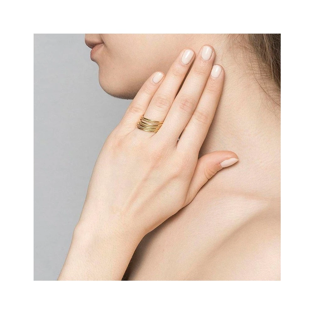 Cette bague plaquée or est composées de plusieurs anneaux vrillés et lisses reliés par une barre.