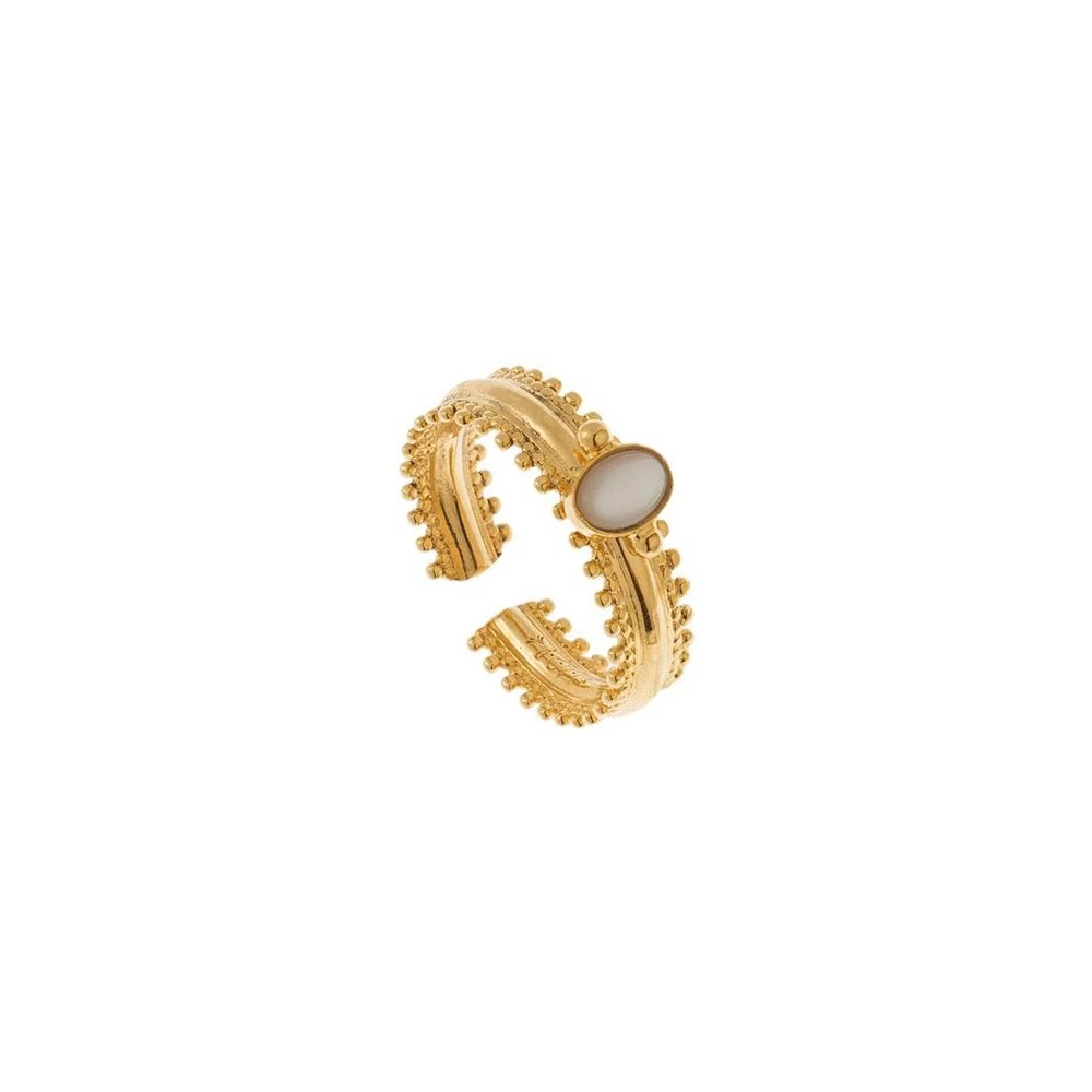 Cette bague fine en laiton plaquée or signée LA2L. Elle est texturée et décorée d’une pierre semi-précieuse nacre.