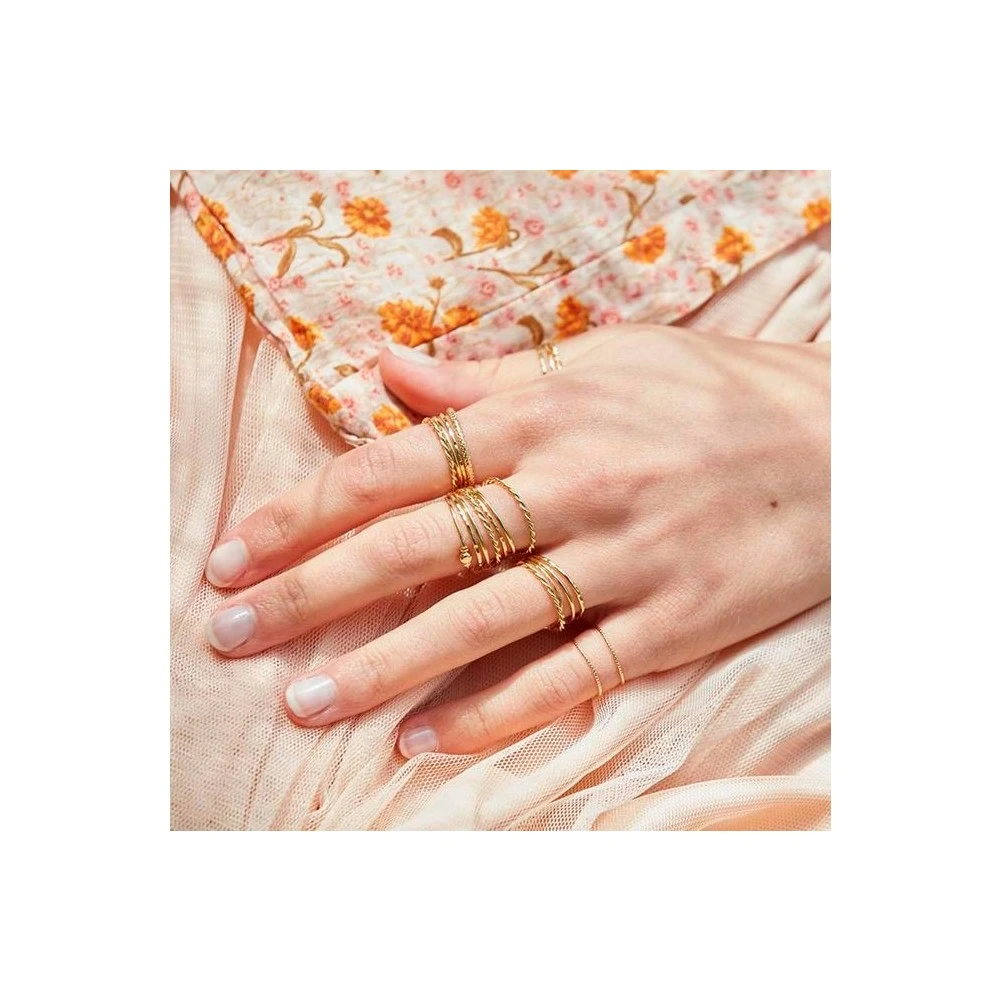 Cette bague en plaqué or est composée de 2 anneaux lisses et d’un anneau vrillée, et est signée BDM Studio.