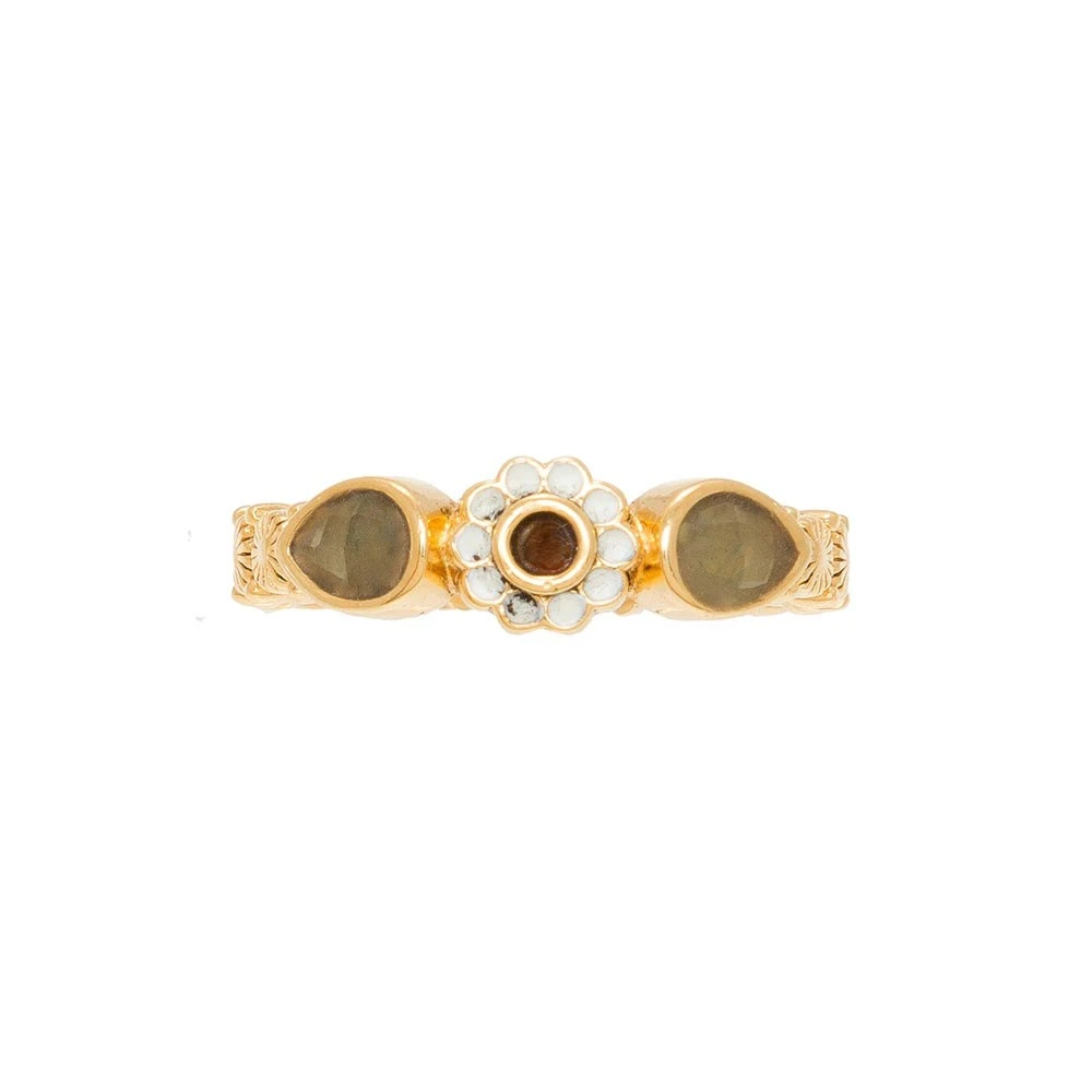 Il s’agit d’une bague composée de pierres semi-précieuses en aventurine et d’une fleur émaillée à petales blanches.