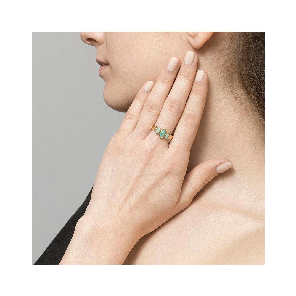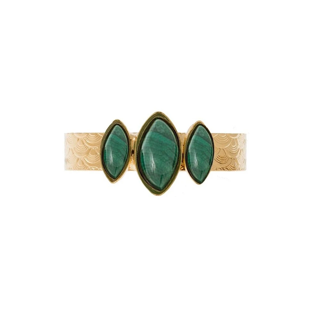 Bague fine texturée en laiton trempée dans un bain d’or, signée Aurélie Joliff, serti de trois pierres en malachite.