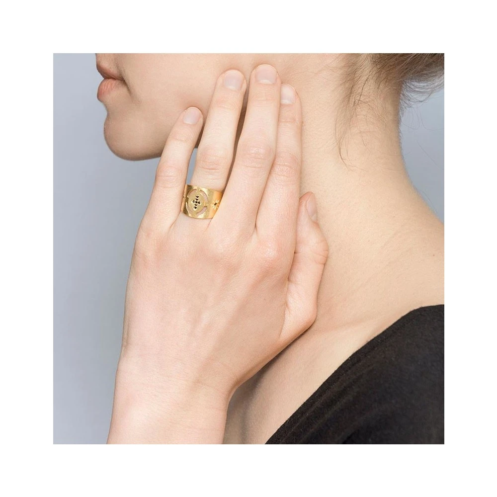 Cette bague est une création de Une A Une. Elle est dorée à l’or fin et agrémentée de zircons noirs en forme de croix.
