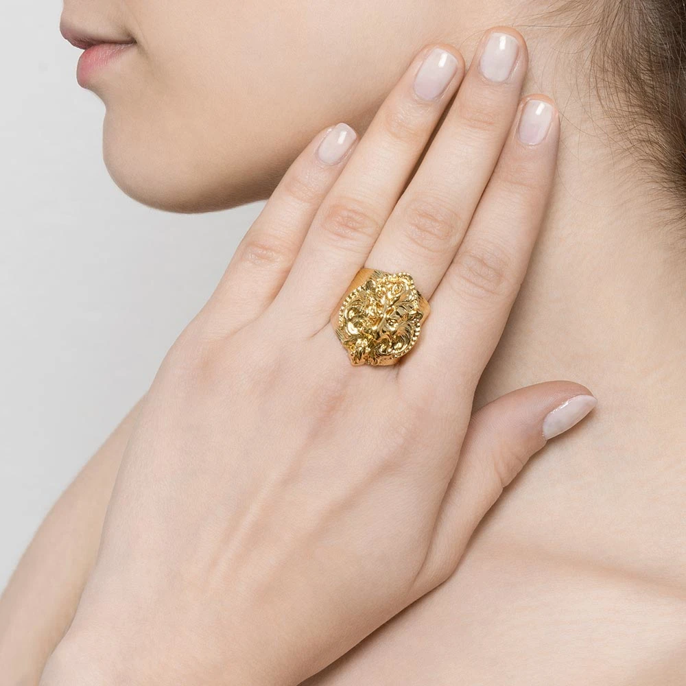 Bague tête de lion en laiton doré signée Dear Charlotte.