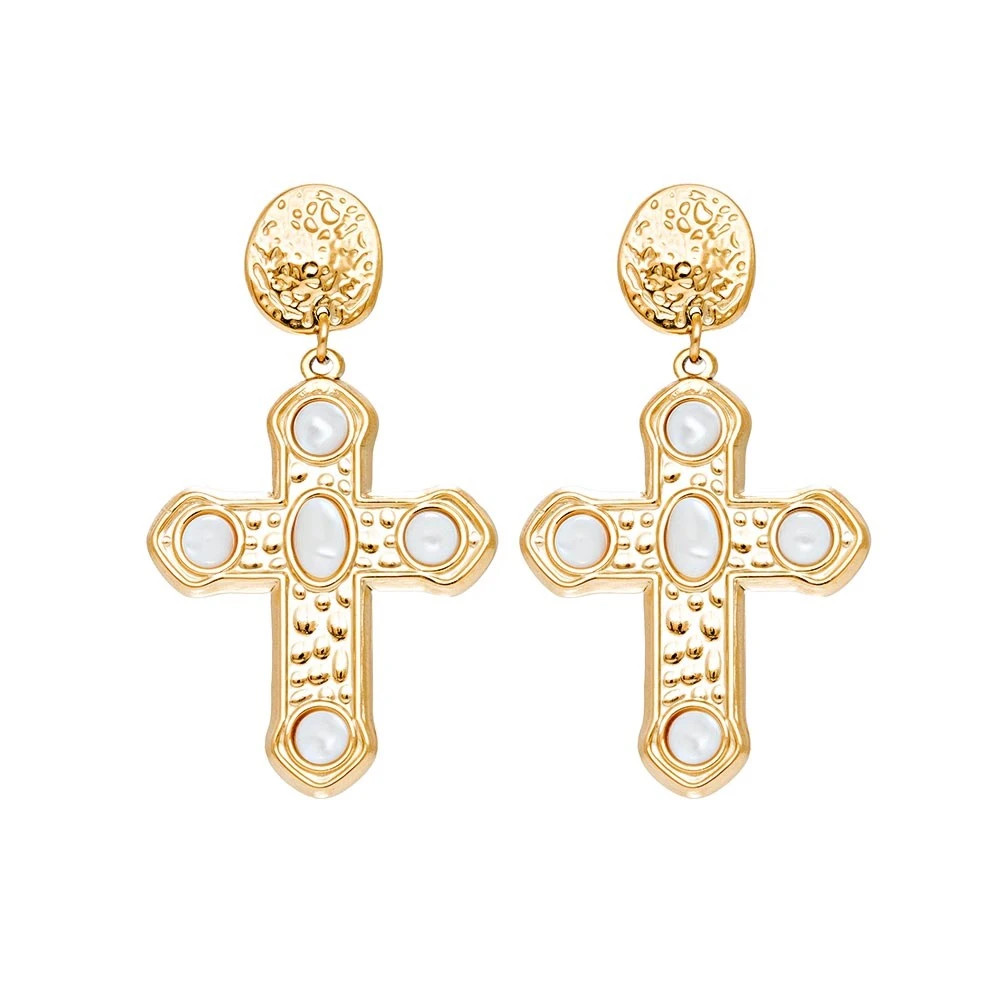 Ces boucles pendantes signées Siloé Paris sont composées d’une puce ronde martelée et d’un pendentif en forme de croix agrémenté de perles de culture. Elles sont en acier chirurgical trempé dans un bain doré.