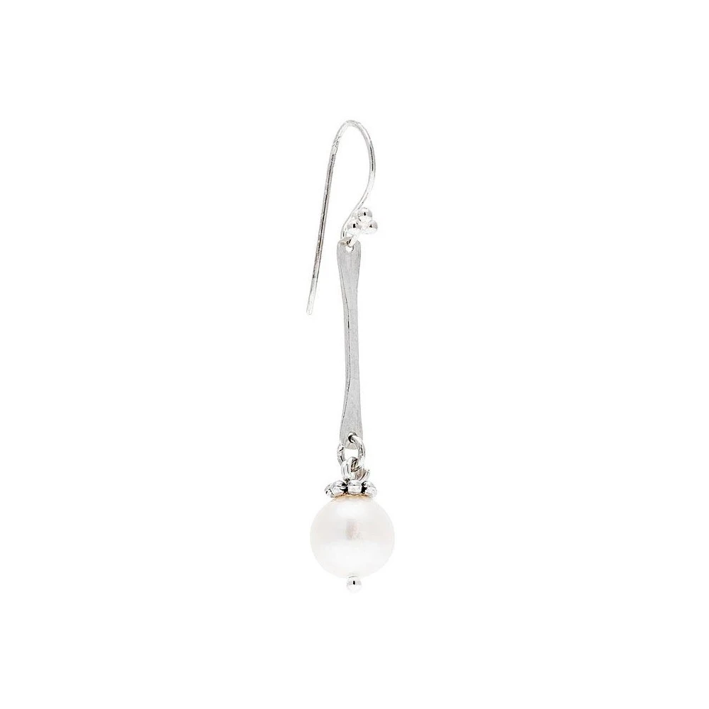 Elancées et élégantes, ces boucles d’oreilles en argent signées Lotta Djossou jouent au pendule avec une perle nacrée suspendue au bout d’une tige en argent.