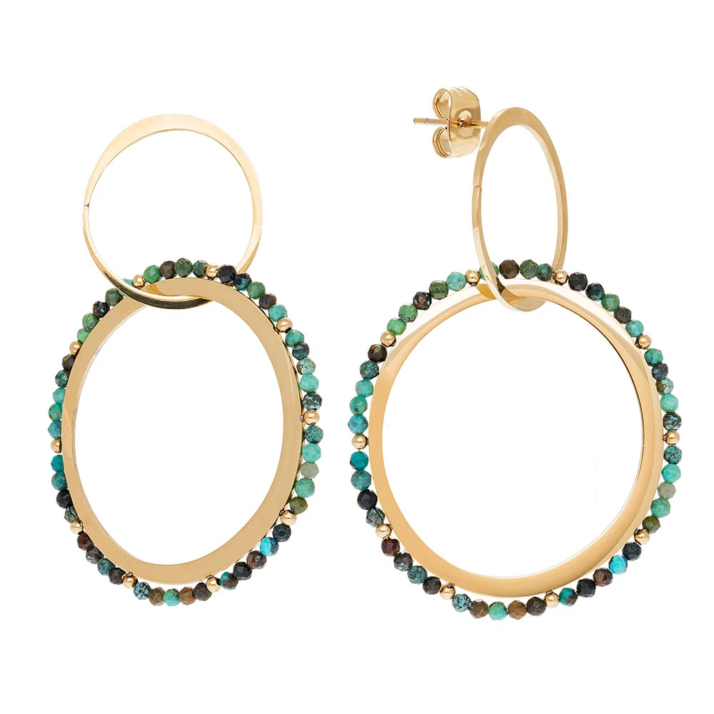 Boucles d’oreilles double anneaux entrelacés agrémentés de fines pierres en turquoise africaine signées Siloé.