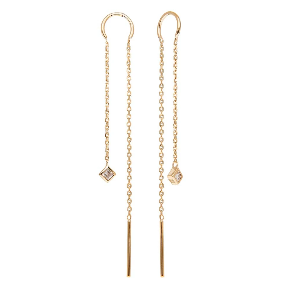 Ces boucles fines pendantes sont composés une fine barre et d’un losange avec un zircon en son centre. Elles sont en plaqué or et signées By Jollia.